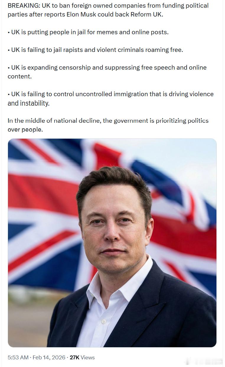 英国将禁止外国公司资助政党,此前有报道称马斯克可能支持改革英国党。