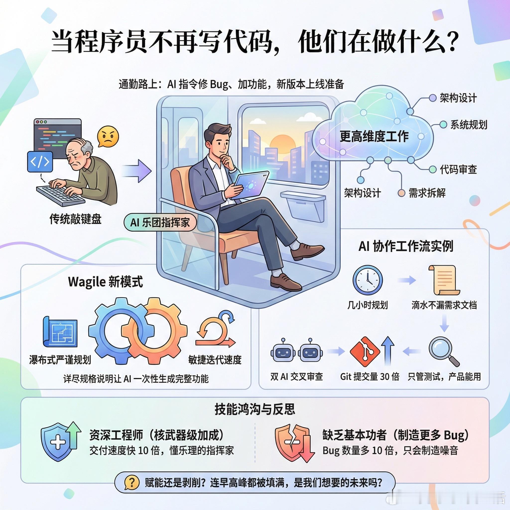 不写代码不等于不做工程。顶尖开发者的时间正在从敲键盘转向更高维度的工作:架构设计、系统规划、代码审查、需求拆解。AI 接管了打字的活儿,但总得有人知道该造什么、为什么造。这就像建筑师早就不用手绘蓝图了,没人觉得 CAD 让他们变得不专业。