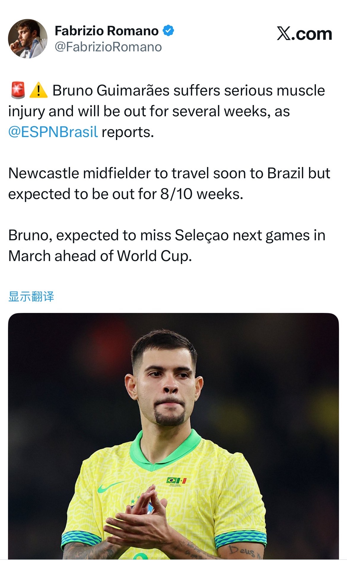 罗马诺援引巴西ESPN报道,纽卡中场核心吉马良斯重伤缺阵8到10周。