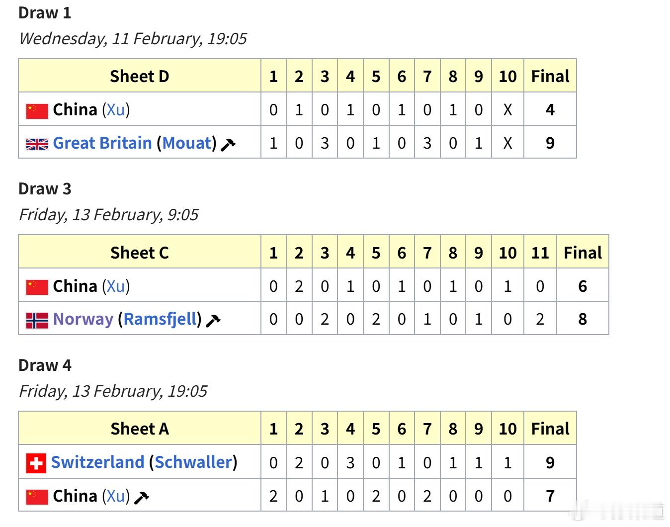 冬奥会冰壶中国男壶遭遇循环赛三连败,今天情人节,晚上应该能搞掉瑞典来个首胜吧。❌2月12日 02:05 中国 4-9 英国❌2月13日 16:05中国 6-8 挪威❌2月14日 02:05 中国 7-9 瑞士❣ 2月14日 21:05 中国 vs 瑞典