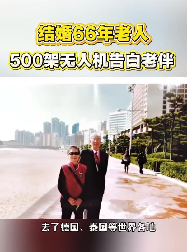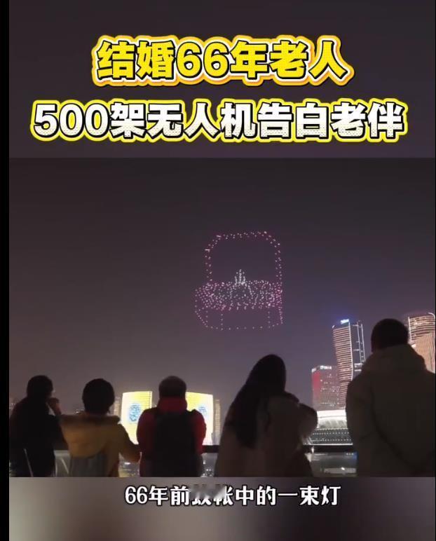 结婚66年老人500架无人机告白老伴66年前,奶奶在蚊帐里借着一束灯光写信,盼的是爷爷平安归来;66年后,爷爷用500架无人机点亮夜空,告白的是那句从未说出口的“谢谢你”。从一盏灯到满天星,照亮的是66年风雨同舟的深情。这才是爱情最该有的样子——始于真心,终于陪伴。66年前蚊帐中的一束灯变成满天星