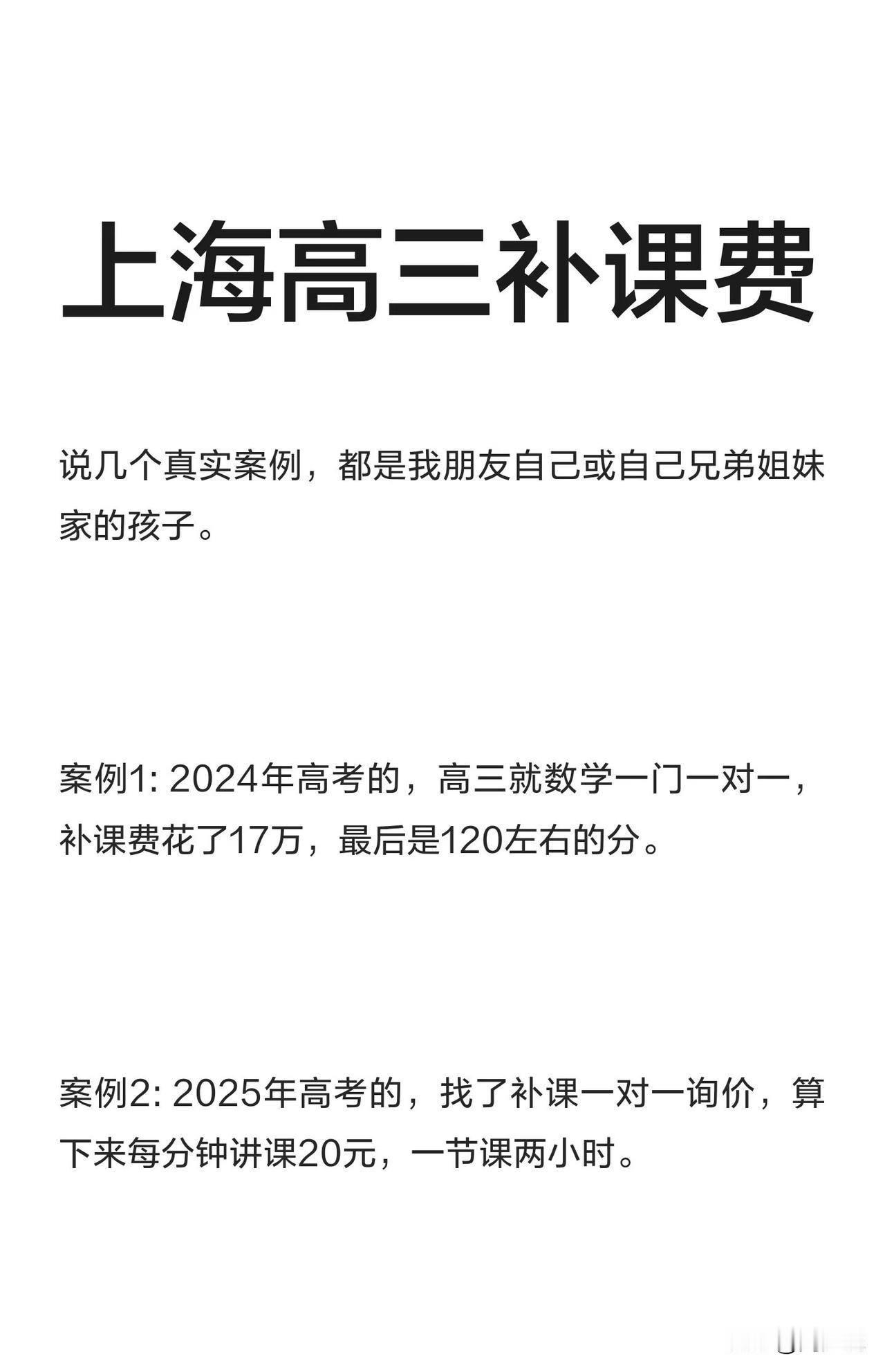 “补课费确实不少!”上海一位高三家长的账单,看得人心里发紧。数学一对一补课,一学期花掉17万;英语单节课收费2200;一周两门课,就要5800。为了孩子提分,不少家庭砸钱丝毫不手软。 这笔补课费曝光后,有网友当即直言:“不是不想补,是补不起,普通家庭一年收入,都不够孩子补课费。” 也有人吐槽:“钱花了不少,孩子成绩没见涨,反而越学越疲惫。” 在周少看来,天价补课费,正在悄悄拉大教育的差距。很多家长抱着“不能输”的心态跟风投入,说到底,是被焦虑推着走。 实际上,教育从来不是简单的金钱比拼,盲目砸钱,未必能帮孩子找准提分的关键,反而可能让孩子失去自主学习的动力。 比起一味跟风补课,不如帮孩子梳理知识漏洞、找到适合的学习节奏。真正的教育公平,不该用金钱衡量;寒门学子的出路,也不全靠补课堆出来。 总而言之,对于花巨资让孩子补课,家长们真应该少点盲目投入,多点理性规划,或许才是对孩子更负责的选择。#寻美三湘#