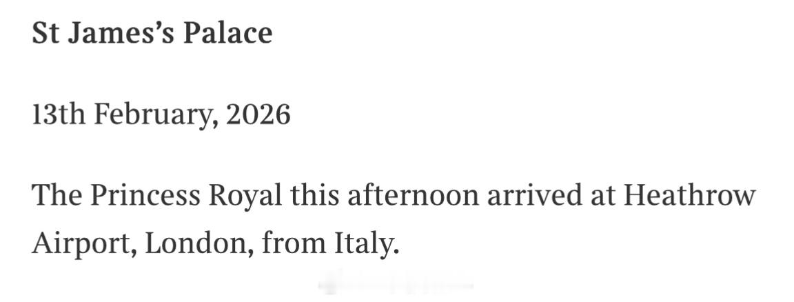 【公务日志】2026年2月13日,安妮长公主正式结束为期1️⃣2️⃣天的意大利冬奥之行返回英国✈️她是2月2日去意大利,直到2月13日才回英国,