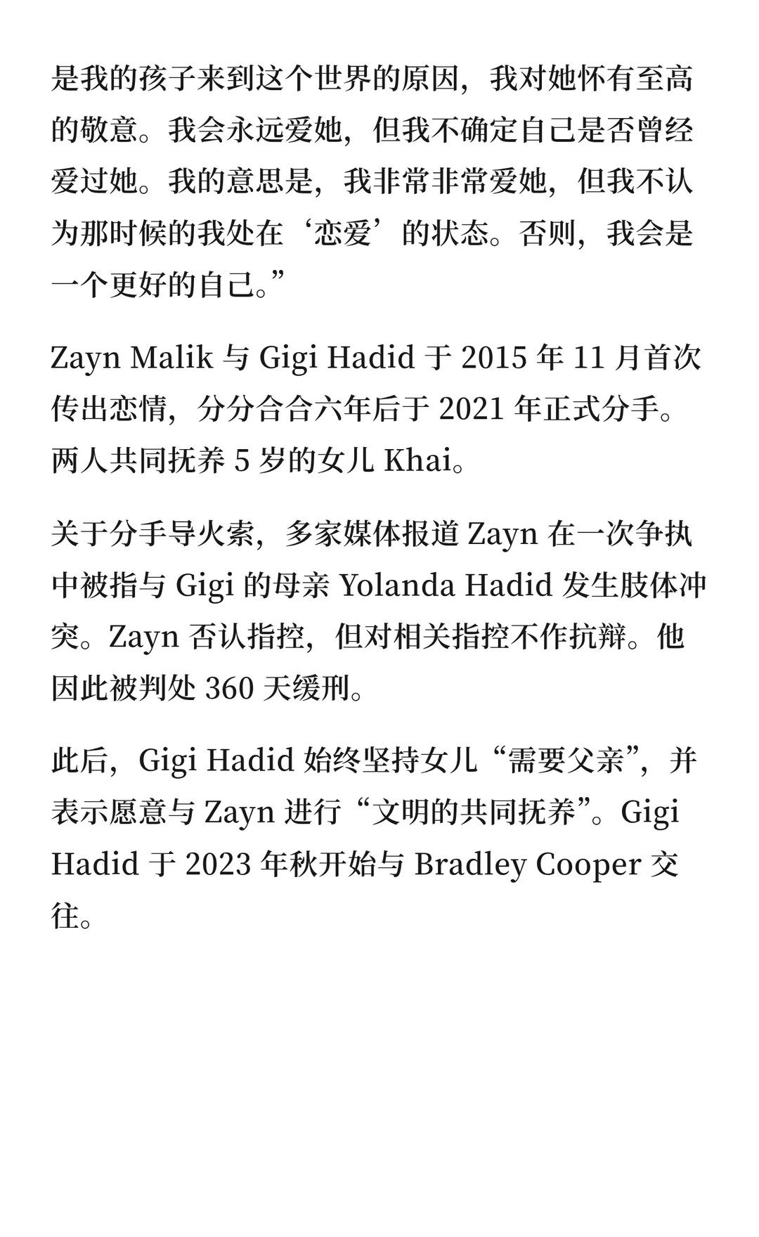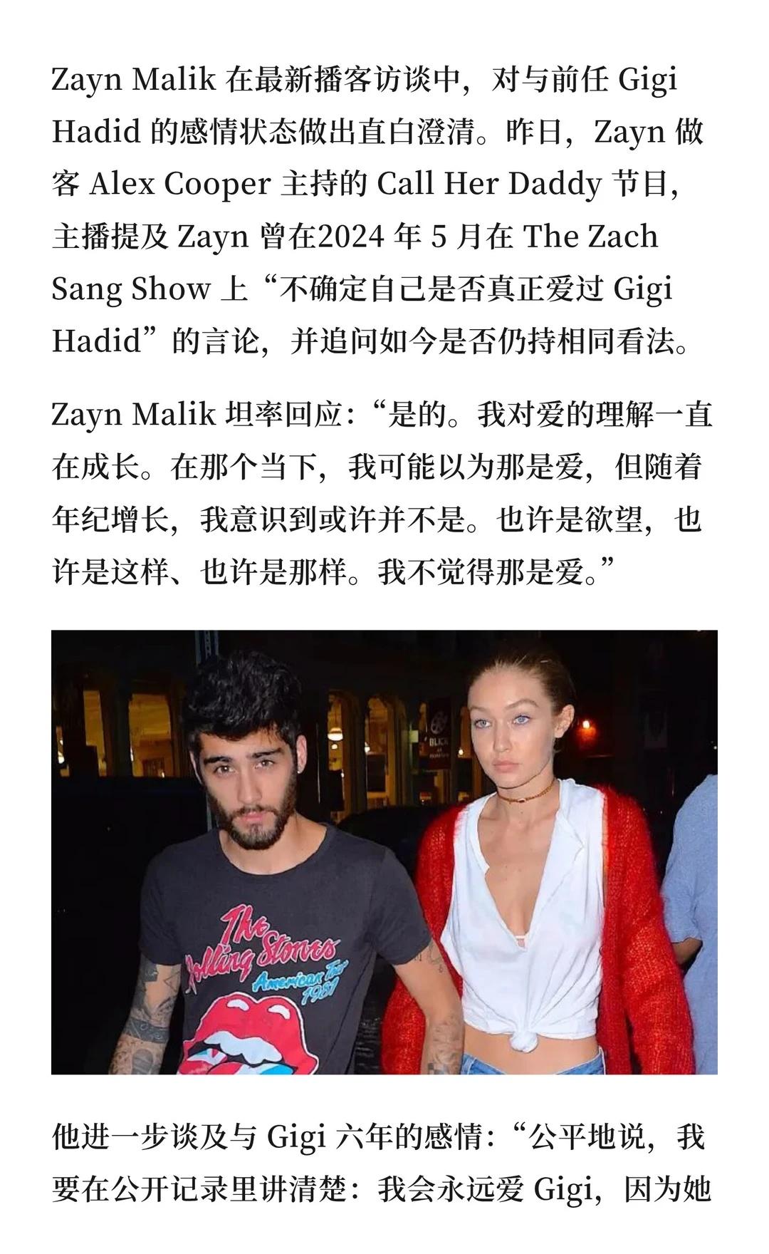 Zayn 再谈与 Gigi 感情:我不觉得那是爱 欧美音乐