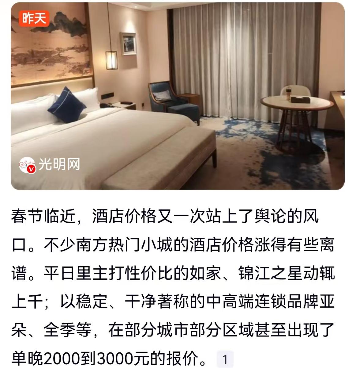 如家敢收一千,亚朵敢卖三千? 春节酒店“天价”账单背后的真问题是这个 春节临近,年味儿还没浓起来,酒店价格的热度倒是先“爆”了。这一次,主角不是三亚、丽江这些传统热门的大城市,而是一批南方热门小城。不少网友发现,平日里两三百元就能搞定的如家、锦江之星,如今动辄上千;而一直主打城市中高端、以稳定干净著称的亚朵、全季,在部分城市的部分区域,报价竟然直接飙升到了单晚2000元到3000元。 这价格一出来,瞬间就把大家伙儿给整不会了。有人调侃:“这哪里是住酒店,分明是住在了金矿上。”更有网友直言:“这价格还不如去定个五星级酒店。”毕竟,在很多人的认知里,经济型连锁酒店图的就是个性价比,现在这身价倍增的架势,确实让人有些摸不着头脑。 对于这波暴涨,舆论场上吵成了一锅粥。有人说这是市场规律,“供不应求,涨价没毛病”,甚至直言“住不起的你不会别住吗”;也有人怒斥这是“趁火打劫”,把“磨刀霍霍向猪羊”挂在了嘴边。公说公有理,婆说婆有理,但这背后的逻辑,真的只是简单的“一个愿打一个愿挨”吗? 咱得承认,春节期间酒店运营成本确实在涨。员工三倍工资、物资物流成本增加,适当涨价大家都能理解。但理解归理解,这尺度得有个边儿。平日两三百涨到上千,涨幅动辄三五倍甚至十倍,这就很难用单纯的“成本推动”来解释了。这更像是一场利用信息不对称和地域流量差异进行的“收割”。正如网友所担心的:“国内旅游环境都是被这些奸商给搞坏的。”这种杀鸡取卵式的定价,透支的是整个目的地的信誉。 更有意思的是这其中的“价格倒挂”现象。亚朵、全季这类中端品牌卖到3000元,而一些正牌的五星级豪华酒店在春节期间可能也就这个价,甚至更低。这时候,消费者就要擦亮眼睛了。花3000元住个快捷装修风格,还是花同样的钱享受顶级服务?这笔账,稍微算算就明白。 这波热潮里,也滋生出了新的“过年姿势”。评论区里有网友淡定表示:“自带帐篷,别有意味!”更有“人间清醒”的群体选择“反向团圆”,或者干脆错峰出行。既然改变不了价格,那就改变行程,用脚投票。 其实,这不仅仅是酒店行业的问题,更是旅游城市服务承载力的一次大考。当小城旅游成为新宠,当地对于住宿价格的监管是否到位?是否有合理的指导价或干预机制?毕竟,游客不是韭菜,这一锤子买卖砸下去,爽的是今年的财报,伤的是未来的口碑。 对于咱们普通老百姓来说,面对这波“天价”行情,最实用的策略莫过于“变通”。要么趁早锁定房源,要么避开那些网红小城,选择周边尚未涨价的替代地。毕竟,春节的核心是团圆和开心,如果因为住个酒店搞得心里添堵,那这年过得可就真没滋味了。市场可以疯狂,但咱们消费者的脑子得清醒,别让“天价”房费成了咱们过年路上的拦路虎。 以上内容仅供参考和借鉴