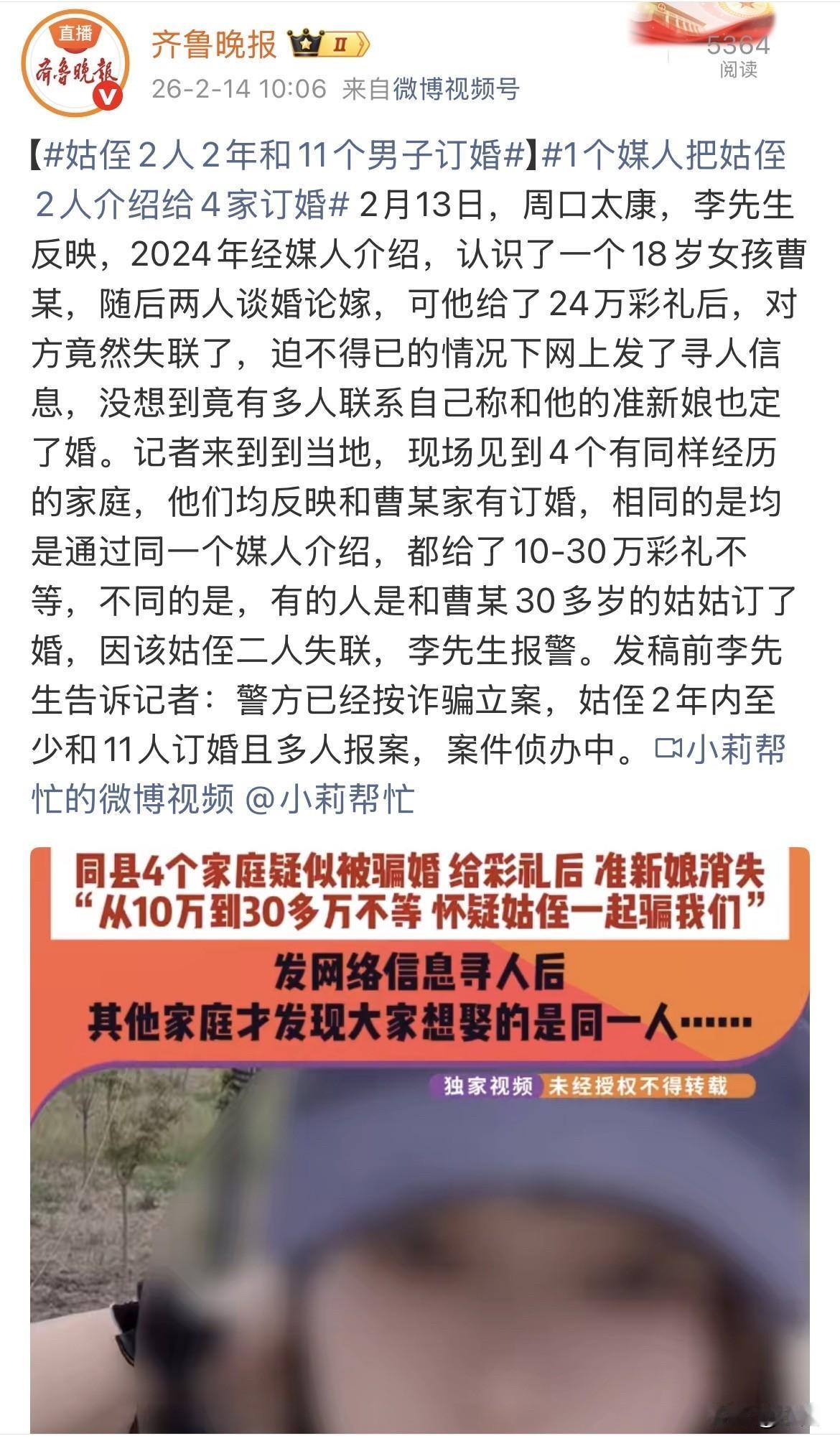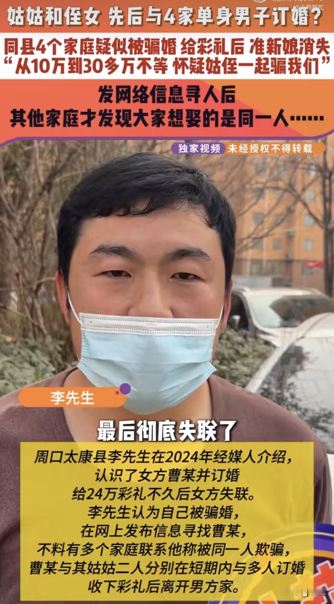天塌了!河南周口,李先生去年经媒人介绍,认识了个18岁姑娘曹某。彩礼给了24万,婚都定了,人跑了。他在网上发寻人信息,结果评论区炸了——好几个男的跳出来说,这女的也跟我订过婚。 李先生懵了。 他去找记者,记者陪他到太康当地一打听,更离谱的事来了。 现场一下子来了4个家庭,都说和曹某家订过亲。 给的彩礼,从10万到30万不等。 有的跟曹某定的,有的跟她30多岁的姑姑定的。 媒人是同一个人。 这姑侄俩,2年之内,跟至少11个男的订过婚。 一个男的给二三十万,11个是多少? 少说两三百万。 有个受害人说,订婚那会儿,姑娘可热情了,天天发微信,嘘寒问暖。 一家人高兴坏了,以为儿子终于有着落了。 彩礼凑齐送过去,婚礼日子定了,亲戚都通知了。 然后,人没了。 打电话不接,发微信不回,跟人间蒸发一样。 他们聚在一起一对,才发现这姑侄俩玩的是同一个套路。 媒人牵线,快速订婚,要彩礼,然后失联。 有的受害者甚至跟姑姑订过婚,压根没见过几面,钱就给出去了。 李先生已经报了警。 发稿前他收到消息,警方立案了,定性诈骗。 姑侄俩目前至少跟11人订婚,多人报案,案件还在查。 这事最让人后背发凉的是那个媒人。 所有受害者的红线,都是同一个人牵的。 他是真不知道,还是装不知道? 要是装不知道,那他拿了多少回扣? 要是真不知道,那这姑侄俩得有多能演,能把一个媒人也骗过去? 有人算了一笔账,11个受害者,就算平均一家20万,那也是220万。 这还是报案的,没报案的还有没有? 姑侄俩这两年,等于在周口开了个“订婚公司”,来一个宰一个,宰完就跑。 农村家庭娶个媳妇多难,掏空积蓄,借遍亲戚,就为了儿子能成个家。 二三十万砸进去,换来的是一张订婚照,和一个人间蒸发的新娘。 钱没了,人没了,年也没法过了。 有人说,这姑侄俩要是真进去了,判多少年? 按诈骗罪算,涉案金额几百万,刑期短不了。 可那些受害家庭的日子,谁来赔? 彩礼钱能不能追回来,还是个未知数。 这事你怎么看? 是姑侄俩太能演,还是这些男的太着急?