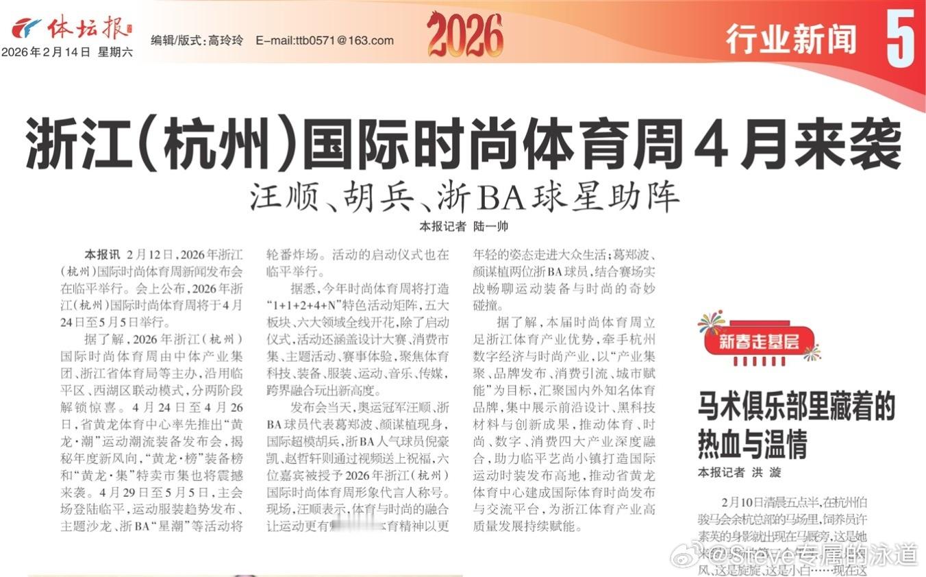 发布会当天,奥运冠军汪顺、浙BA球员代表葛郑波、颜谋植现身,国际超模胡兵,浙BA人气球员倪豪凯、赵哲轩则通过视频送上祝福,六位嘉宾被授予2026年浙江(杭州)国际时尚体育周形象代言人称号。现场,汪顺表示,体育与时尚的融合让运动更有魅力,让体育精神以更年轻的姿态走进大众生活;葛郑波、颜谋植两位浙BA球员,结合赛场实战畅聊运动装备与时尚的奇妙碰撞。顺流而上浙江杭州国际时尚体育周游泳(体坛报/2026.14.)