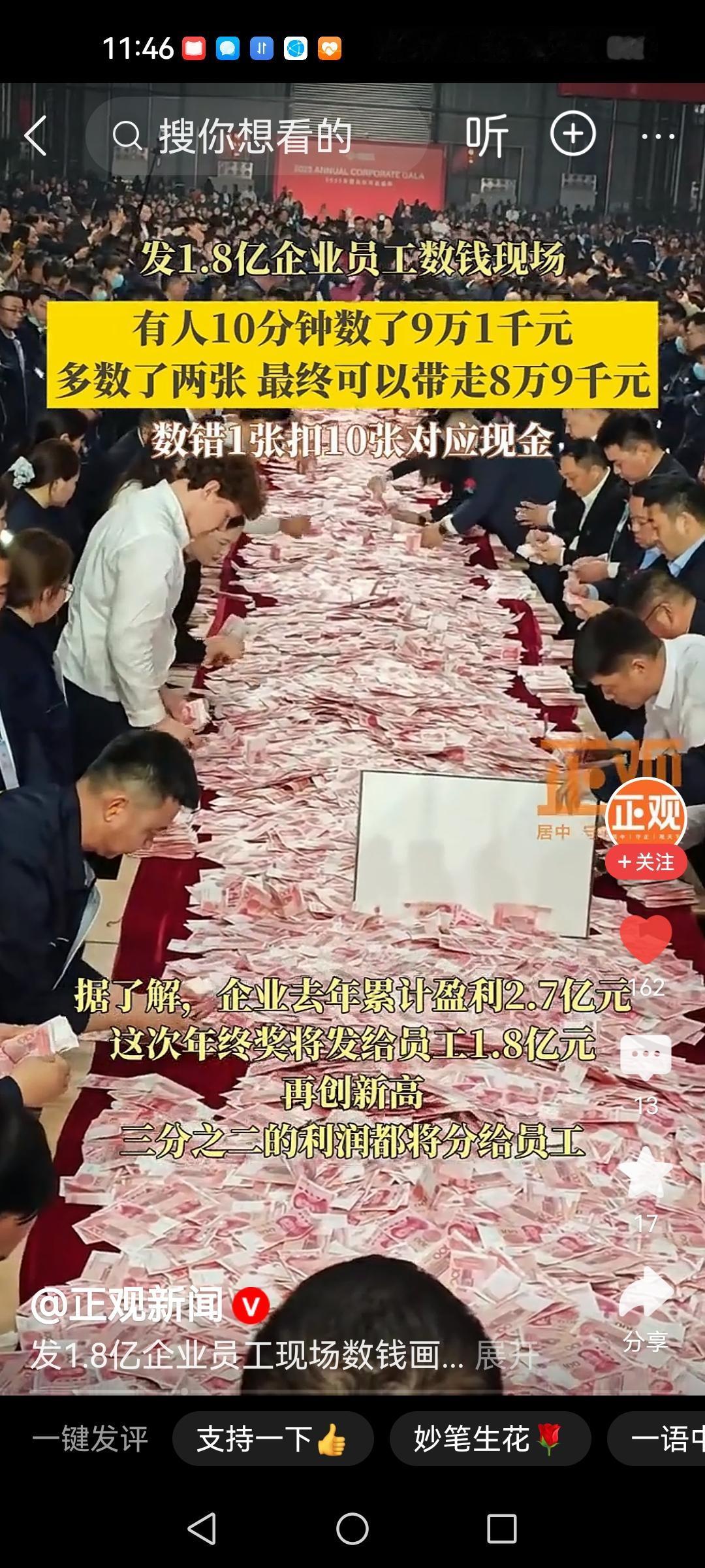 戳了多少企业家的肺管子? 员工领钱数了近10万:手都抽筋了 河南矿山,这几年高调发钱,高调支持孝顺父母,还没毛病,人家自己的钱,随便发,又不违法。 就是有点磨眼球,一堆红彤彤的钞票,数多少就给多少,凭本事领奖金,这年过的太有点心想事成的吧? 老板嫌发的少,留下自己够用的,其余的都发了,数多少就给多少,看样子,像是乌托邦,是不是博眼球先不说,首先就刺瞎了别的老板们的眼球。 这么好的事儿,竟然没有跟进的,说明戳了别人的肺管子了吧?猜想,老板们都在背后骂他吧? 做他的员工,确实是够幸运的,能量正,发钱还管够,工作积极性肯定杠杠的。