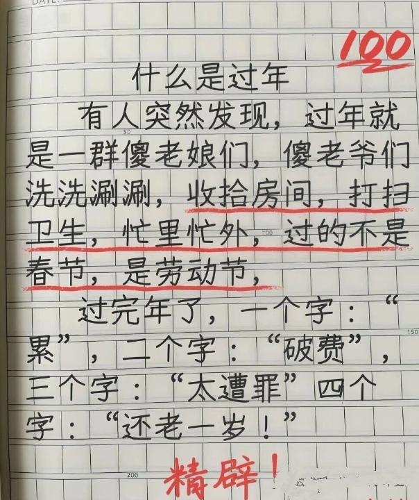 啥叫过年?这小家伙总结得太精准了。过年呐,就是一群大老爷们和老娘们洗洗涮涮,收拾卫生,打扫房间,忙进忙出,过的哪是春节,分明是劳动节。 过完年,用一个字形容,累;俩字,破费;仨字,太遭罪;四个字,又添一岁。