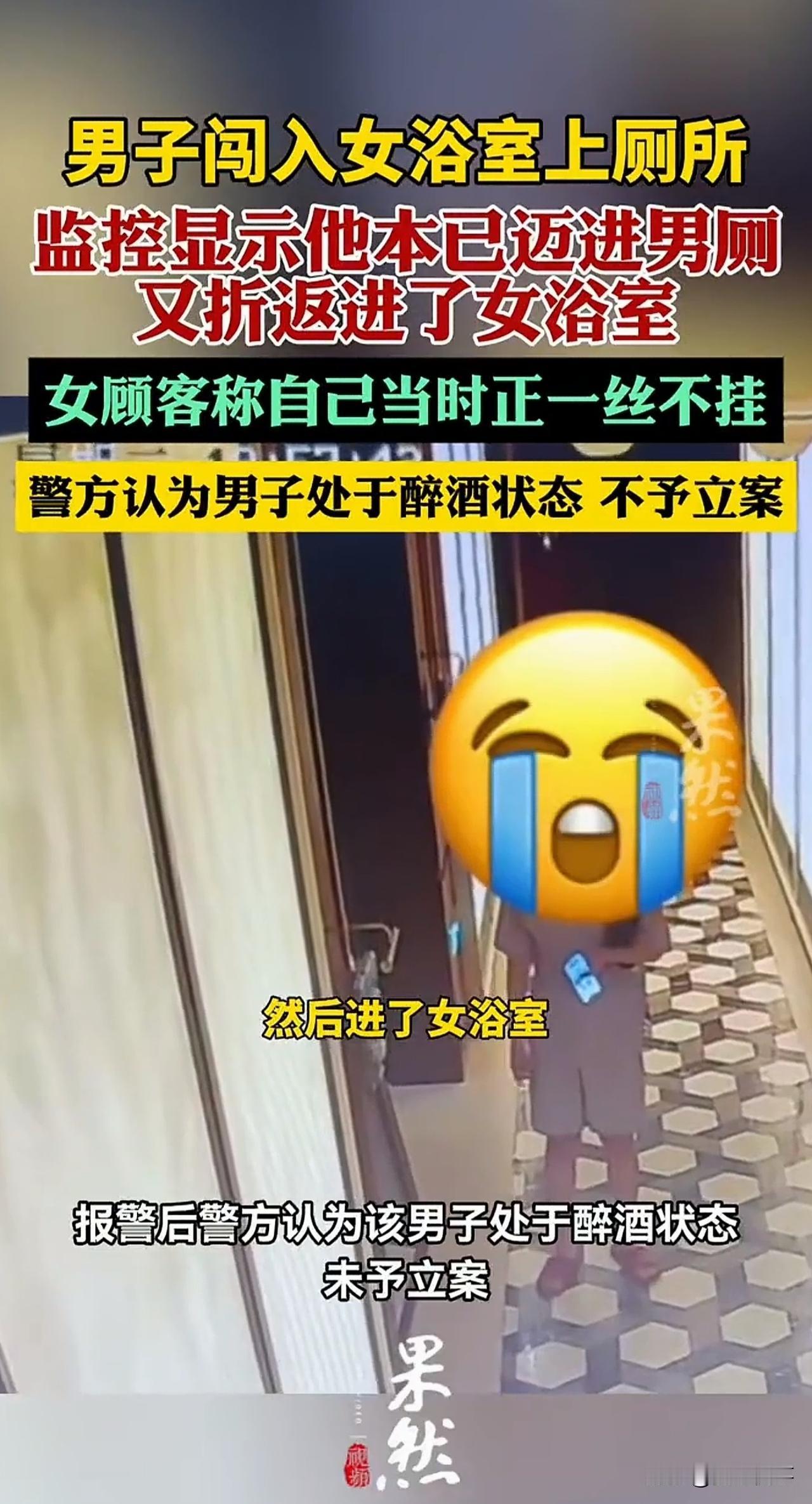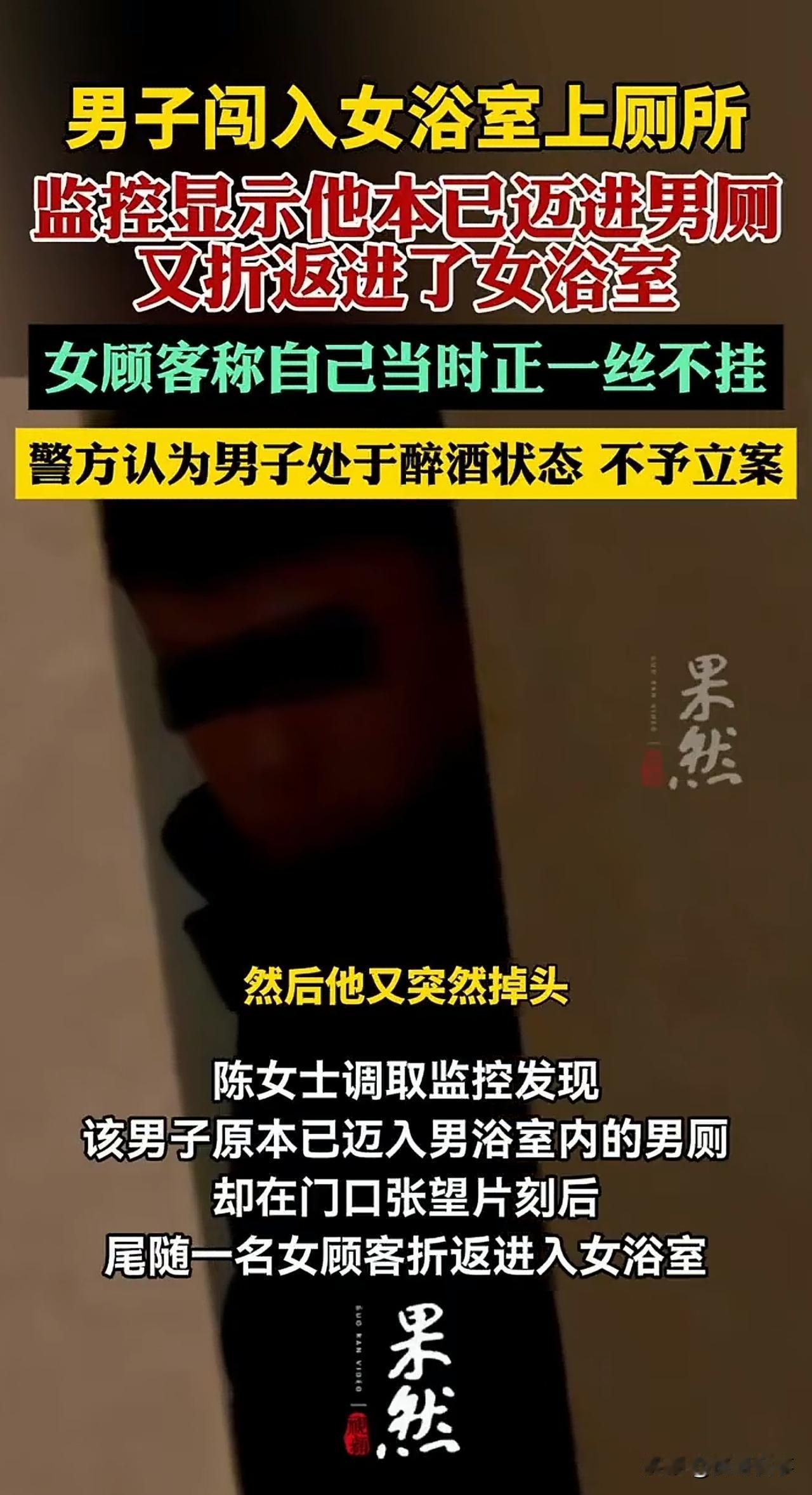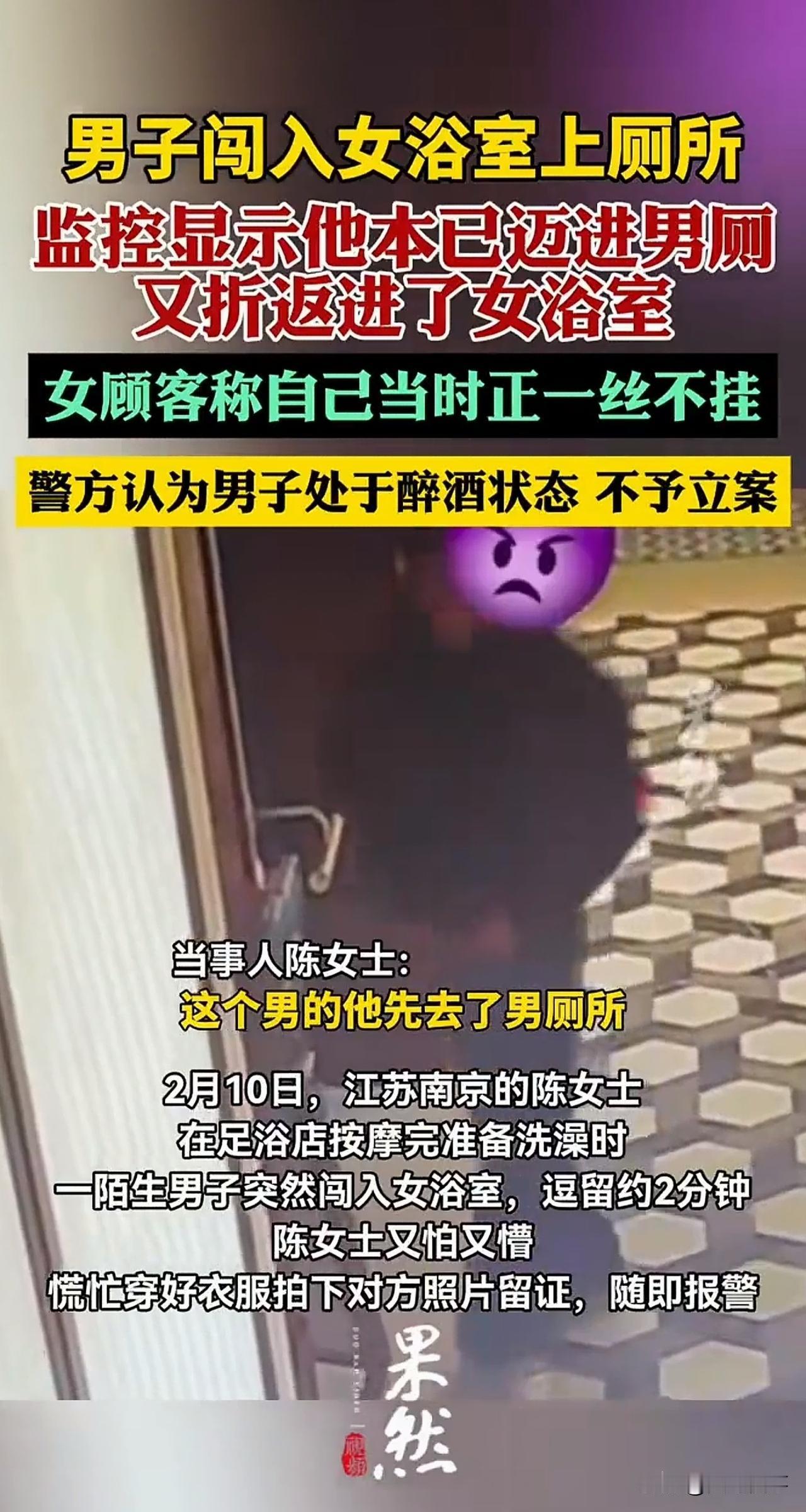 “这谁能忍?”江苏,一女子前往按摩店放松。当她褪去衣物,走进浴室准备洗澡时,一名陌生男子竟突然闯入,这一幕让女子大为震惊。这还不算完,男子在浴室里足足待了两分钟才离开。女子又羞又恼,穿好衣服后,果断拨通了报警电话。然而,警方最终的处理结果,让女子一时之间难以接受。 2月10日,家在江苏南京的陈女士,来到当地一家足浴店中准备按摩放松。 按摩结束后,陈女士走进女浴室,在确认内部无人后,她便褪去衣物,准备舒舒服服洗个热水澡。 就在此时,浴室门突然被猛地推开,一名浑身酒气的陌生男子径直闯了进来。 这突如其来的一幕,让陈女士瞬间大脑空白,她只能僵在原地,羞耻与恐惧瞬间席卷全身。 而这名男子闯入后,并未立刻离开,反而像木桩一样站在原地,足足逗留了近2分钟。 在男子出去后,陈女士慌乱穿好衣物后,第一时间拿出手机拍照留证,随后赶紧拨打了报警电话。 警方来到现场后,通过调查监控发现,该男子起初明明走向的是男浴室,脚都已经迈进男厕所门口了,却并未进入,反而在门口东张西望。在看到一名女顾客走向女浴室后,他立刻刻意折返,一路尾随进入了女浴区。 而女浴室门口,则立有“男性禁入”的警示牌,十分醒目。 陈女士觉得这男子就是故意闯入的,导致其身心都受到了极大的伤害,她希望警方能依法处理,还自己一个公道。 可最终的处理结果,却让陈女士很失落:警方以男子处于醉酒状态为由,决定不予立案。 陈女士始终想不明白,难道醉酒就能成为侵犯他人隐私的挡箭牌?难道女性的私密与尊严,在一句“喝多了”面前就一文不值? 此事曝光后,立刻引发网友热议。不少网友力挺陈女士,直言醉酒从来不是免责理由,监控实锤故意尾随闯入,绝非简单的醉酒误闯; 也有网友表示,足浴店存在严重的安全管理漏洞,作为私密场所,未能有效阻止异性闯入,理应承担责任。 但也有少数人觉得,对方只是醉酒失态,不必过于较真。 从法律角度来说, 《治安管理处罚法》第15条明确规定,醉酒的人违反治安管理的,应当给予处罚。 简单来说,醉酒的人违法犯罪,依法并不能免除责任。 本案中,男子故意闯入陈女士所在的私密浴室,侵犯他人隐私,已涉嫌违法,并非一句醉酒就能一笔勾销的。 而商家作为经营方,若没有尽到安全保障与隐私保护义务,则同样也难辞其咎。 无论如何,陈女士的隐私受到侵犯是不争的事实,即便男子不承担行政或是刑事责任,也要向陈女士赔礼道歉,进行赔偿等。 毕竟,酒水是男子喝的,喝醉了也是男子自愿的行为,不能说他自己喝多了惹出事,却让别人来承担代价。那样,公平何在?法理又何在呢? 对此,大家怎么看?欢迎在评论区留言。