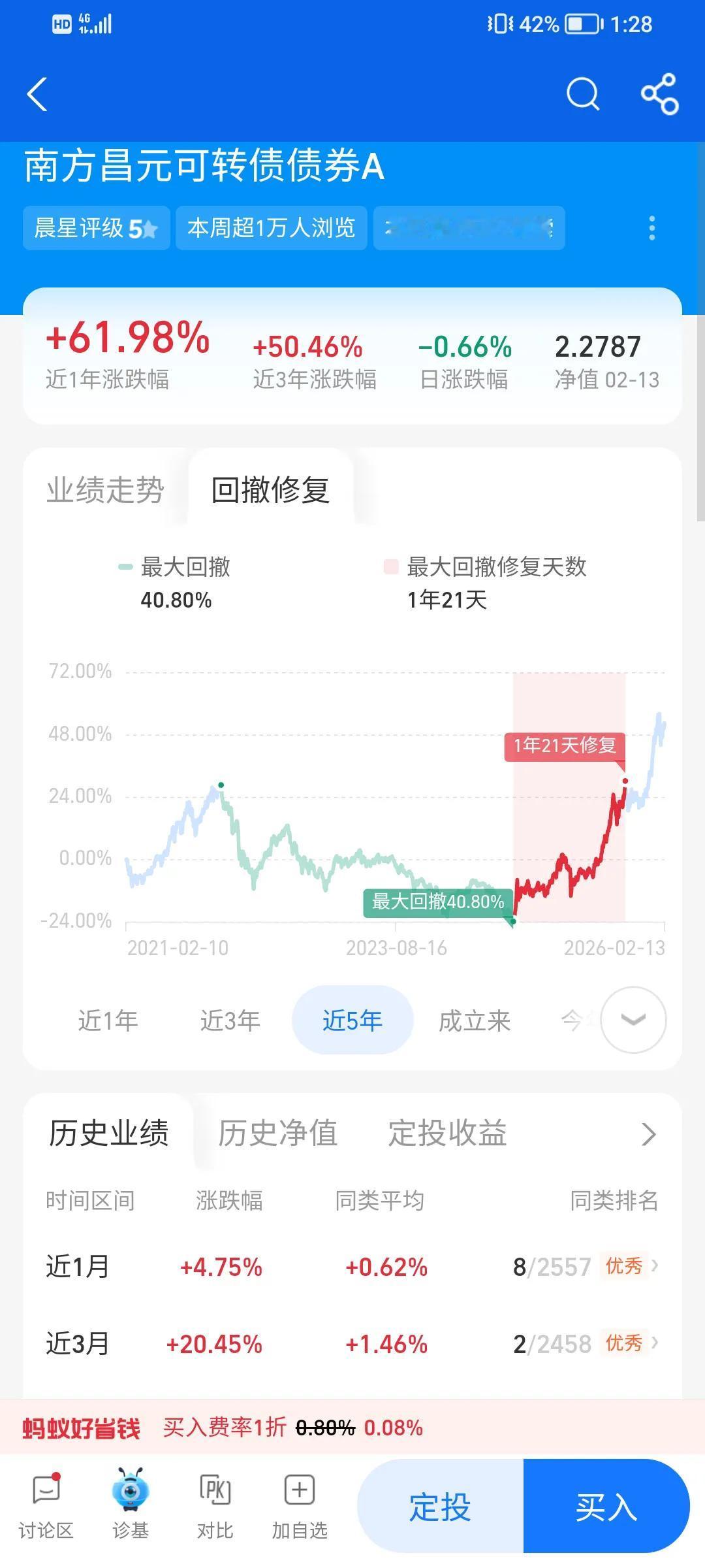 今天在支付宝查看可转债基金,发现它们一年的涨幅率可不小,甚至有些还超过某些股票型基金,虽然被冠以债券型的名号。虽然收益率高,但风险也高,绝大部分可转债基金评级都是中高风险,就拿南方昌元可转债债券 A来说吧,虽然一年收益高达61.98%,但近五年最大回撤40.8%,修复时间也要一年多。