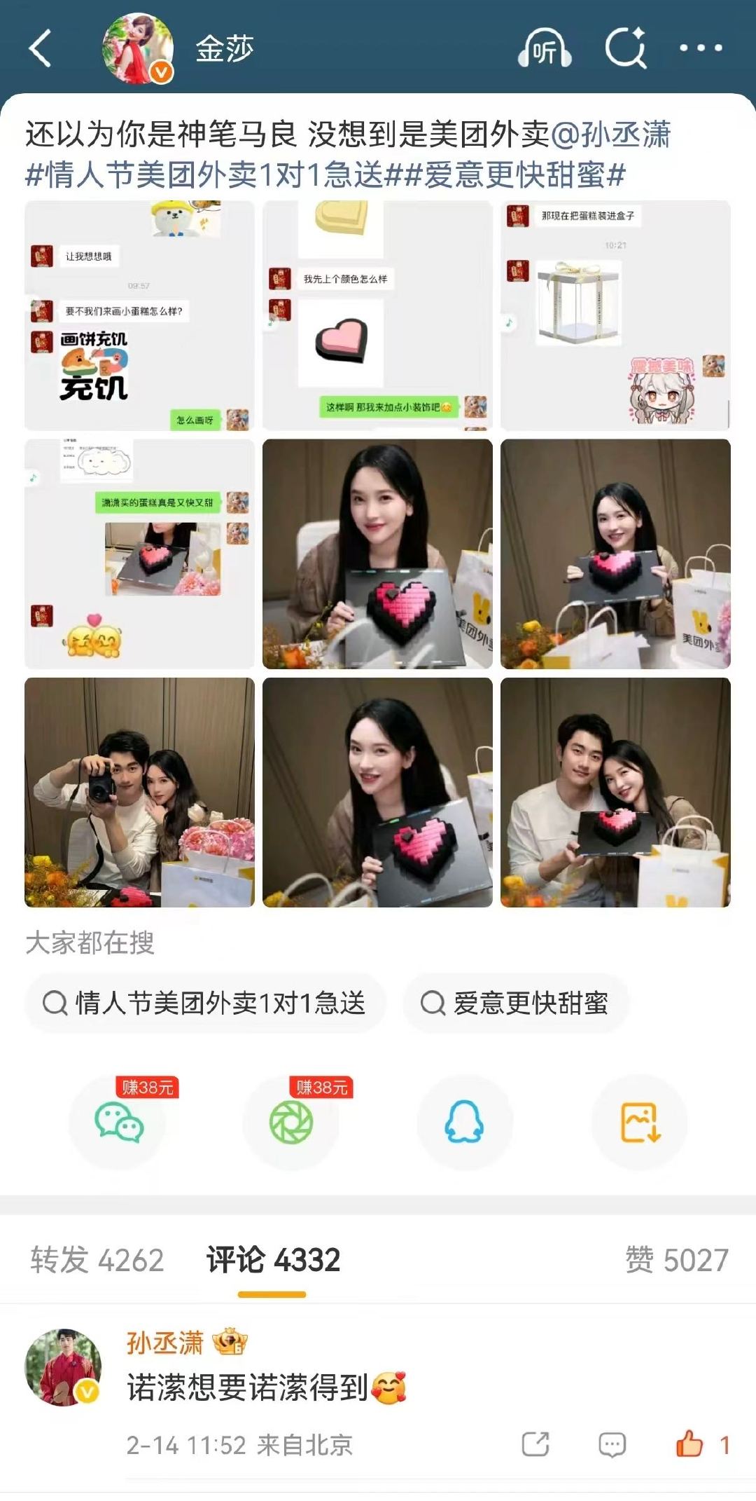 大反转!🍉 本以为金莎晒的是“画饼”现场,结果是大型“圆梦”现场!大家都说男人的嘴爱“画饼”,但孙丞潇这波操作,简直是“反向画饼第一人”!懂的人都懂,好的感情就是把每一个细节落到实处。情人节上美团外卖选1对1急送,平均提速20分钟🍰爱意蛋糕69.9元起,更有大牌奶茶、咖啡限时外卖专属折扣等你来拿,下单满38元抽鲜花免单券,想法不落空,心意也不迟到。不用反复确认,体验专属于你的极速浪漫~上美团/美团外卖App搜索🔍【心意1对1】领1对1急送体验券,心意马上到,好运也送来!情人节金莎想要金莎得到情人节美团外卖1对1急送爱意更快甜蜜