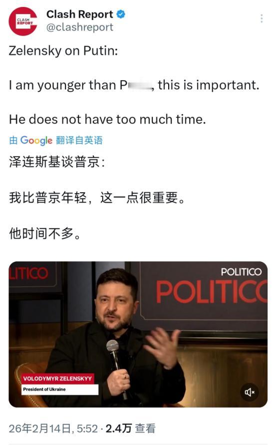 泽连斯基北京时间2月14日接受采访时谈到普京:“我比普京年轻,这一点很重要。他时间不多。” 按照泽连斯基这个逻辑,他其实也可以去跟美国前总统特朗普这么说。要知道,特朗普是1946年出生的,今年已经78岁了,泽连斯基1978年出生,比特朗普整整年轻20岁,要是按他“年轻就重要、对方时间不多”的说法,他也能说特朗普时日不多了。 可泽连斯基绝对不敢这么说,因为他还得指望美国的援助,不敢得罪特朗普,也不敢得罪美国。说到底,他拿普京的年龄说事,不过是挑软柿子捏,嘴上装硬气,心里早就没底了。 俄乌冲突已经打了快四年了,现在的战场形势,对乌克兰一点都不乐观,泽连斯基在战场上拿不到任何便宜,只能靠嘴炮找存在感。 就在几天前,也就是2月10号左右,有消息显示,俄军已经快要夺取乌克兰东部3个战略要地了,扎波罗热州的胡里艾伯勒镇,几乎已经完全被俄军控制,乌军只剩下几栋建筑还在勉强坚守,镇上95%的兵力都是俄军。 这个镇子是扎波罗热州除了首府之外,最后几个还被乌军控制的城镇之一,丢了这个镇子,乌军在扎波罗热州就没什么可依托的据点了,俄军下一步就能直接逼近扎波罗热市郊区,到时候当地百姓就要面临全天的空袭威胁。 不光是扎波罗热州,顿涅茨克州的形势也很糟糕。乌军重点防守的波克罗夫斯克和米尔诺赫拉德两座城市,虽然暂时挡住了俄军的进攻,但俄军一直在不断增兵,慢慢消耗乌军的兵力。 军事专家都说,乌军现在严重缺人,前线每公里的区域内,步兵还不到10人,很多旅级部队里,步兵比例还不到10%,而正常情况下,这个比例至少要超过30%。 为了补充兵力,泽连斯基在2月10号还签署了总统令,允许60岁以上的老人,只要通过体检,就能以合同制的方式参军,合同期限一年,还能延长,这足以说明,乌军已经缺人缺到走投无路,连老人都要拉上战场了。 除了缺人,乌军还缺装备、缺弹药、缺无人机。前段时间,乌军准备了6000架FPV无人机,本来想趁晚上偷袭俄军的军事仓库和指挥点,结果一夜之间就全没了,要么是被俄军的防空系统打下来、被电子干扰失去控制,要么就是自己操作失误,击中了存放无人机的地方,把自己的无人机全炸没了。 现在乌军的无人机缺口超过70%,关键的纵深作战中,连摧毁前线25英里以内目标的能力都没有,无人机操作员更是少得可怜,现有力量只能覆盖全长745英里前线的30%,根本不够用。 更让泽连斯基头疼的是,乌军的逃兵越来越多,还有大量适龄男性想方设法逃避参军。 据统计,现在已经有20万乌军士兵偷偷逃亡,还有200万适龄男性躲着不参军,就算泽连斯基不断扩大征兵范围,甚至调整征兵政策,也根本改变不了兵源枯竭的现状。 前线的士兵,不仅缺人缺装备,连弹药都不够用,有的士兵每天只能分到10发子弹,连基本的防护装备都没有,说白了就是去送死,这样的战场形势,泽连斯基怎么可能有底气? 泽连斯基心里比谁都清楚,战场上面拿不到的东西,靠嘴炮和年龄优越感,是绝对换不来的。 俄乌冲突打到现在,乌克兰的经济早就垮了,2025年的GDP比冲突前下降了38%,2026年的预算赤字高得吓人,国防支出吞掉了近六成的总预算,普通老百姓的生活水平倒退了几十年。 近一半的电力设施被俄军炸毁,前段时间极寒天气,零下28℃的时候,基辅、哈尔科夫等大城市,数十万户人家断水、断电、断暖,医院只能靠发电机勉强维持运转,老人和孩子连冻都快冻不住了,这样的困境,靠他说一句“我比普京年轻”,根本解决不了。 更幼稚、更危险的是,泽连斯基作为乌克兰的总统,居然把国家的命运,押在对手的生理时间上,盼着普京因为年龄大而有变化,这简直是不负责任到了极点。 他本该把所有心思都放在解决国家的难题上,琢磨怎么结束战争,怎么争取真正有用的援助,怎么让老百姓过上安稳日子,怎么保住乌克兰剩下的土地。 可他倒好,不想着解决实际问题,反而天天在采访里耍嘴皮子,拿年龄嘲讽普京,以为这样就能挽回面子,就能改变战场形势,这根本就是异想天开。 可能有人会说,欧洲不是刚通过了900亿欧元的援乌贷款吗?可大家要清楚,这900亿欧元是贷款,不是无偿援助,以后乌克兰还是要连本带利还的,而且这笔钱里面,600亿欧元用于国防,300亿欧元用于国家预算,根本解决不了乌克兰的根本困境。 更关键的是,美国对乌军援已经大幅缩减,从2024年的140亿美元,骤降到今年的4亿美元,特朗普还一直施压,让泽连斯基放弃顿巴斯地区,用领土换和平。 更让人揪心的是,美俄正在谈一个12万亿美元的合作计划,一旦达成协议,美国很可能会彻底抛弃乌克兰,到时候泽连斯基就算再年轻,也没用。