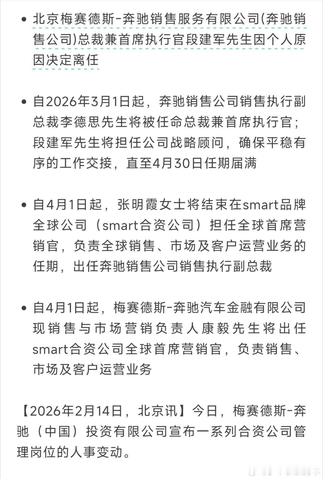 突发,北京奔驰和smart发生人事变动,这是对奔驰电动智能化转型的一次调整,尤其是合资加速本土化过程必然需要协调全球资源,需要更强有力的执行力。