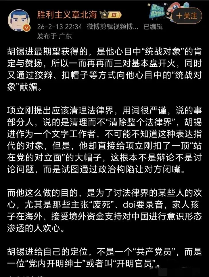 针对胡锡进对项立刚提出的要对国内法律界进行清理的反驳,这位网友对胡锡进的这样做的目的进行了点评,我感觉他说得很有道理。 胡锡进在他那篇对项立刚观点的批驳文章中,上来就给项立刚扣上了几顶大帽子,如果是一般的网民,恐怕直接要被这些大帽子吓个半死。当然项立刚不是一般人,他对老胡扣上来的那些大帽子,逐一进行了反击。 而这个网友通过这件事一针见血地指出,胡锡进这人始终如一地站在广大人民群众朴素情感的对面。胡锡进之所以要这么做,主要是为了讨法律界某些人的欢心,比如那些主张废除死刑的,那些把家人孩子安排在海外的,那些接受海外资金支持对中国进行渗透的人的欢心。 胡锡进确实太精明了,他向来都是道义放两旁,利字摆中间,平衡术运用得炉火纯青,可谓老谋深算!他与项立刚之间的这手较量,我认为不论是从逻辑表达和文字组织能力方面来看,项立刚这个“搞通信”的都在胡锡进这个“搞文字”的之上!胡锡进此人不愧为当代“岳不群”!只可惜现在群众的眼睛越来越亮,眼里很难再容沙子,如果胡锡进再如此下去,他只有退网一条路可走!
