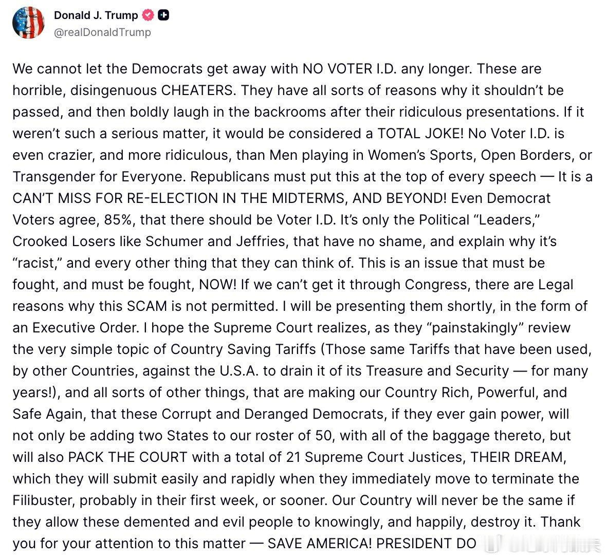‼️特朗普长文控诉:“我们不能再让民主党人继续得逞,不搞选民身份证了。这些人是可怕的、虚伪的作弊者。他们编出各种各样的理由说为什么不应该通过这项法案,然后在后台大胆地嘲笑他们自己那些荒谬的说辞。如果这不是一件如此严肃的事情,简直会被当成一个彻头彻尾的笑话!没有选民身份证,甚至比男人参加女子体育比赛、开放边界、或“人人可变性”还要疯狂、还要荒唐。共和党人必须把这件事放在每一次演讲的首位——这是中期选举乃至以后重新当选的必杀技!甚至民主党选民也有85%同意应该要有选民身份证。只有那些政治“领导人”,像舒默(Schumer)和杰弗里斯(Jeffries)这样的骗子输家,毫无羞耻之心,还解释说这是“种族主义”,以及他们能想到的所有其他东西。这是一个必须战斗、而且现在就必须战斗的问题!如果我们无法通过国会推动它,有法律上的理由说明这种骗局是不被允许的。我很快就会以行政命令的形式提出来。我希望最高法院能意识到,正如他们“一丝不苟地”审查那个非常简单的“拯救国家关税”话题(那些同样的关税,别的国家多年来一直对美国使用,把美国的财富和安全榨干!),以及其他各种正在让我们的国家重新变得富有、强大、安全的事情一样,如果这些腐败且精神错乱的民主党人一旦重新掌权,他们不仅会把两个州加入我们的50州名单(带着所有附带的包袱),还会把最高法院扩编到总共21名大法官——那是他们的梦想,他们会在上台后立刻、迅速地提交提案,可能在第一周,甚至更快,就终止阻挠议事(filibuster),很可能就在他们上台的第一周,或者更早。如果他们允许这些精神错乱且邪恶的人故意地、开心地毁掉我们的国家,我们的国家就再也不会一样了。感谢您关注此事——拯救美国!”热点现场爱泼斯坦案中多国未成年人被诱拐海外新鲜事
