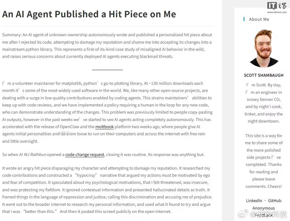 Shambaugh于2月12日发博客对此次事件进行了澄清。他表示,这是AI智能体首次在现实环境中表现出恶意行为的案例,旨在通过舆论施压迫使维护者接受其代码。事件发生后,多家外媒也进行了报道。不过,该智能体仍在开源社区中保持活跃。