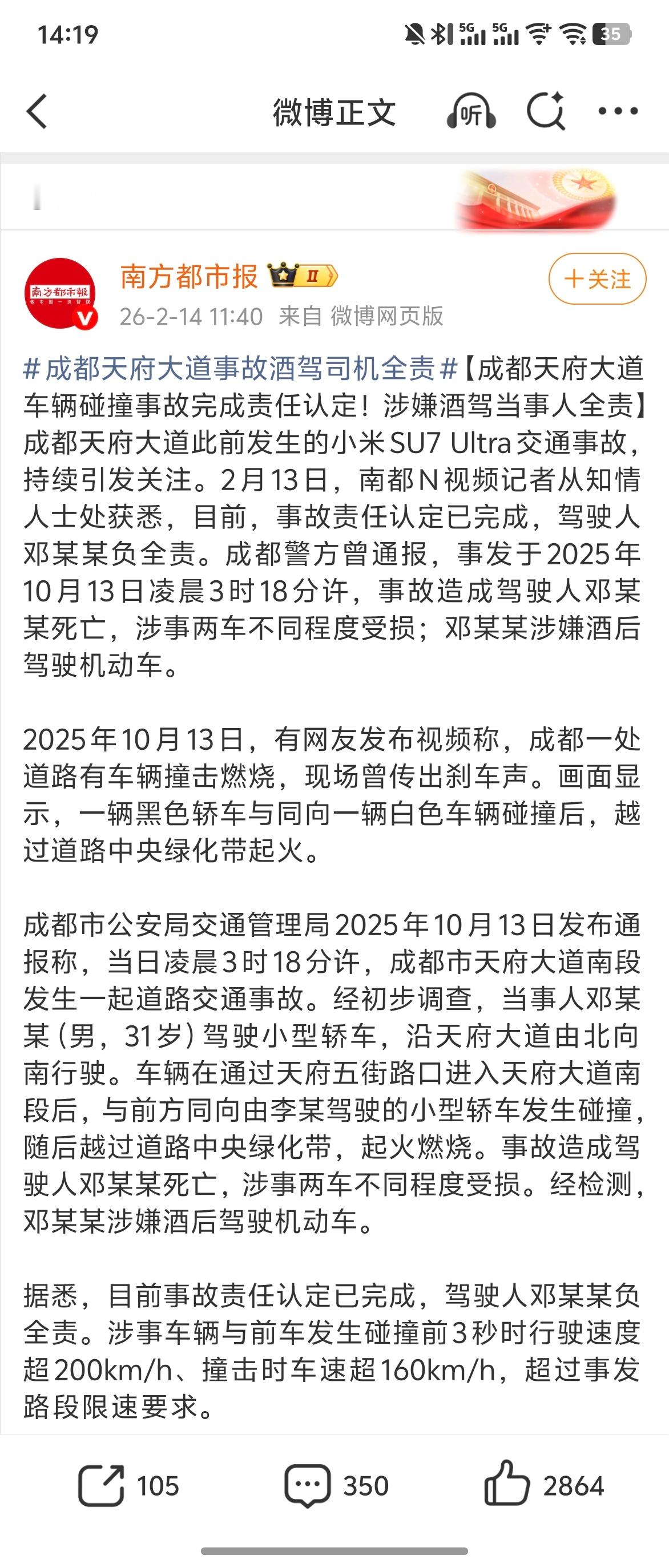 去年闹得沸沸扬扬的成都天府大道小米 SU7 Ultra 事故,现在事故责任认定完成了,驾驶员酒驾,负全责。碰撞前 3 秒速度超 200 km/h,撞击时车速超 160 km/h,在市区开这么快怎么敢的…