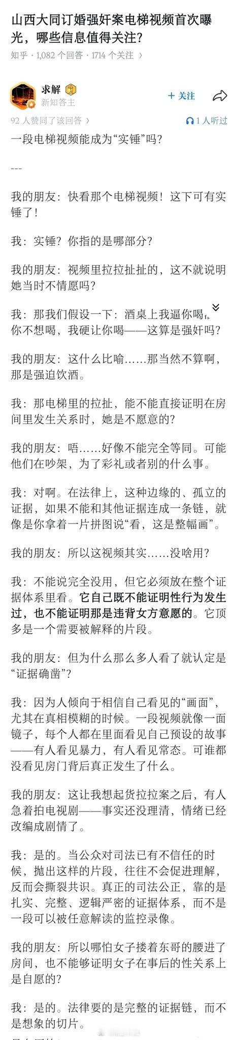 知足常乐 2026-02-14 23:33 文中不懂装懂,狗屁不通。基本上,几乎所有强奸案件,因为其特殊性,通常都是密室作案,没有人会大庭广众之下去强奸,也很少有人特意在按装摄像头的房间作案,所以基本上都是通过受害者自诉,然后进行旁证,看是否能形成完整自洽的证据链,比如这种事前电梯拉扯视频,证明女方并不是心甘情愿跟着男方进屋,有强迫行为,密室发生性关系,事后立刻报警,这样配合自诉是可以形成逻辑自洽的证据链的。