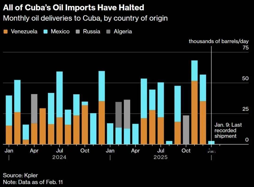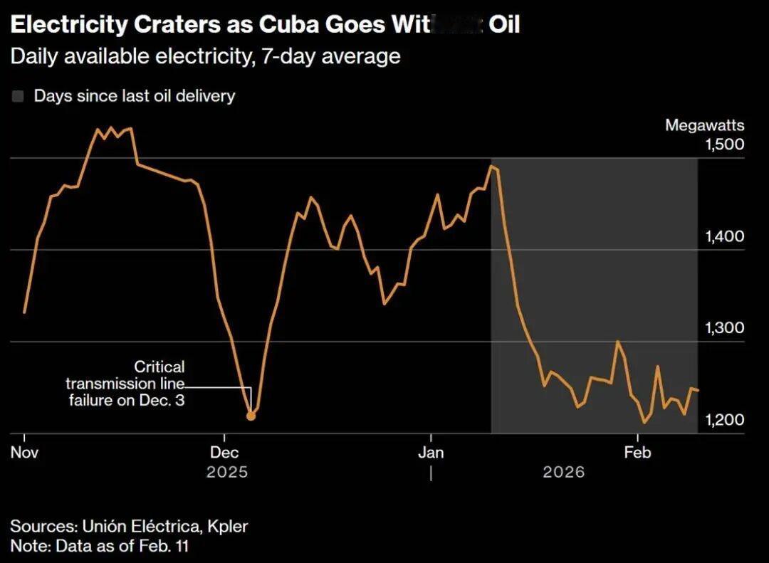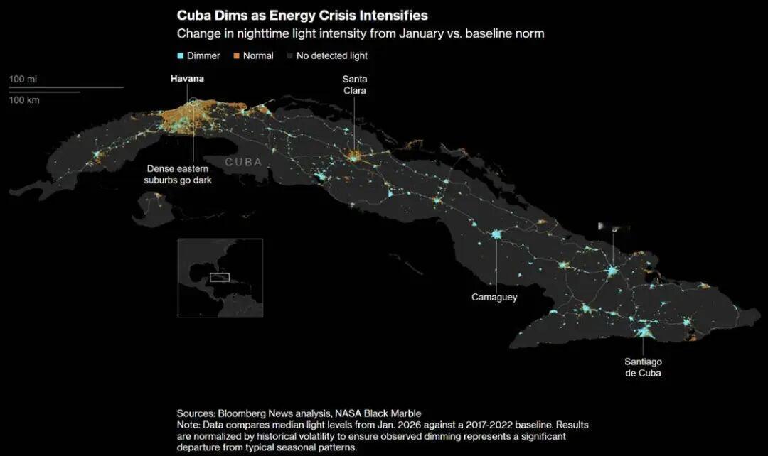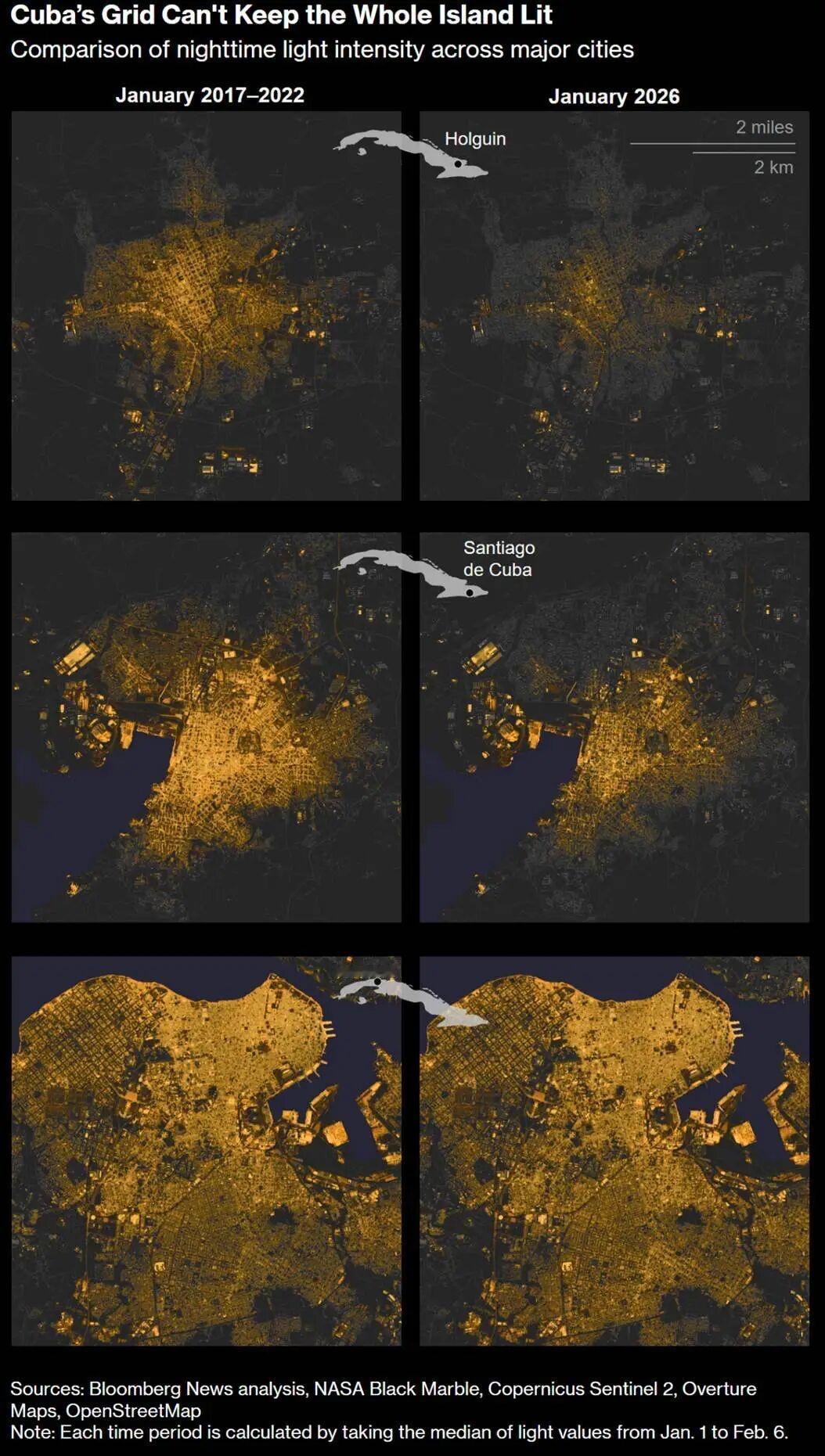 自美国切断对古巴的石油供应后,古巴的停电问题在过去一个月来持续恶化。古巴的电网原本就已十分脆弱,去年12月初的关键输电线路故障导致哈瓦那与古巴主要火力发电厂所在的马坦萨斯之间的电力传输暂时中断,随后特朗普政府又拦截了驶往古巴的大量油轮,其原本运输的原油占古巴每日发电所需的10万桶原油中的60%。自今年年初以来,古巴供电量急剧下降。根据彭博社对卫星影像的分析,这一影响在农村地区和省会城市尤为严重,但哈瓦那受影响较小。 图片来源于网络