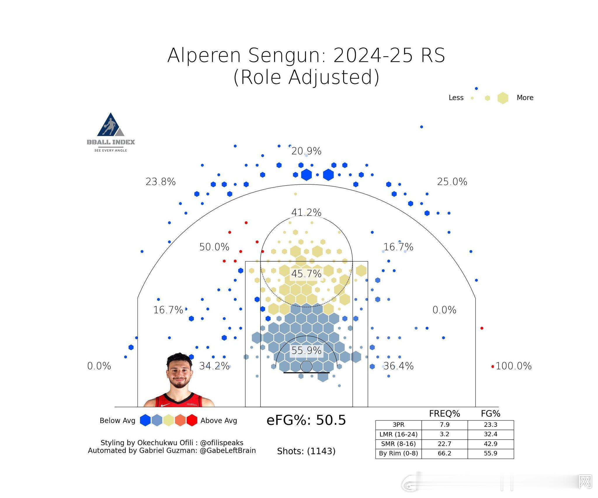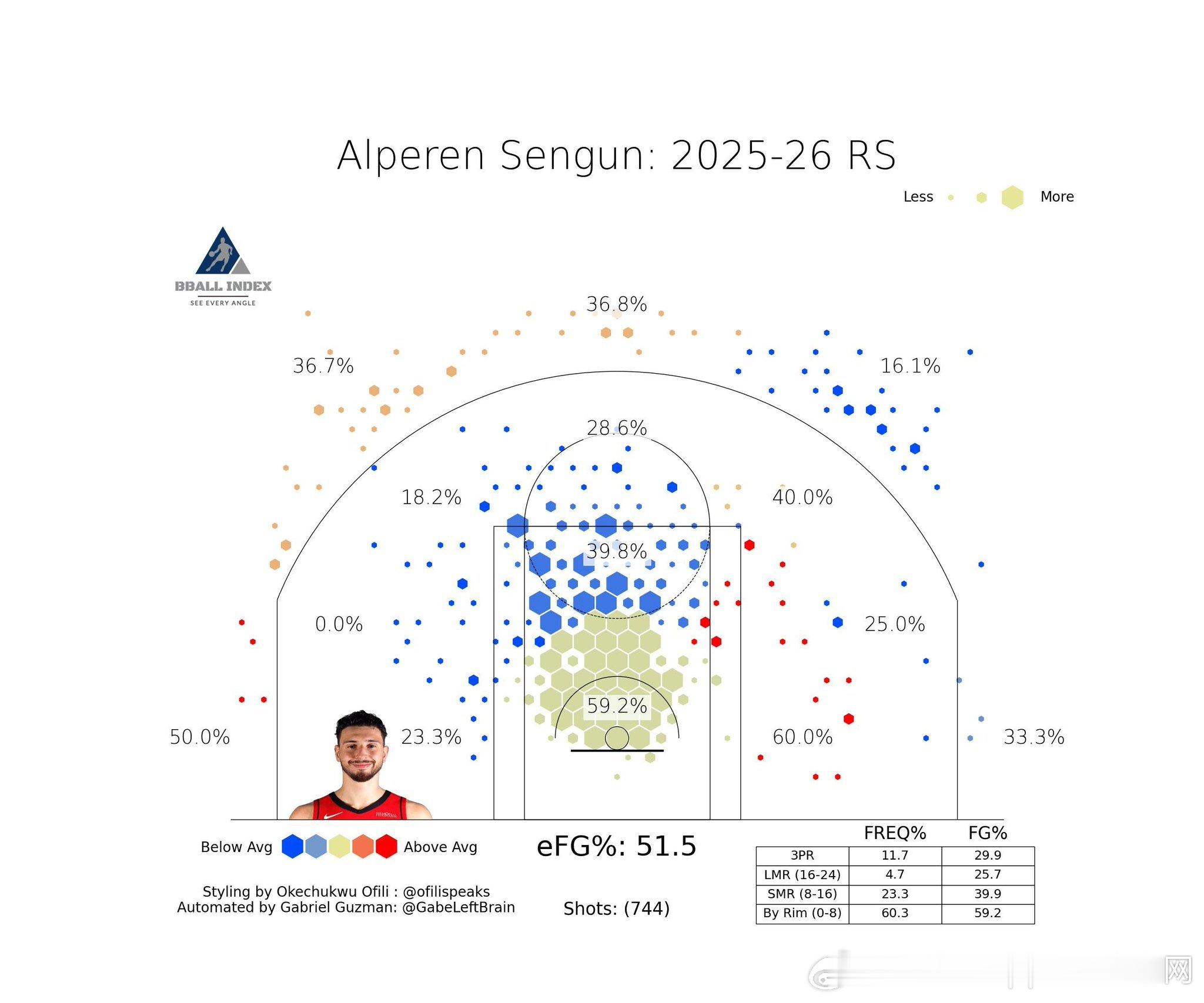 转 bball index的数据📈,申京外线略提升但中距离下滑