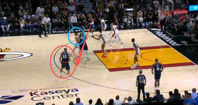 P1保罗底角持球吸引热火防守注意力,与此同时无球端的邓恩、巴图姆沿三分线逆时针空手移动。P2拉尔松防守注意力更多放在持球端、盯无球走神,加上祖巴茨的无球掩护延阻与巴图姆的无球跑位使巴图姆直接获得大空位出手机会,保罗直接一记“隔山打牛”隔着祖巴茨大横传为巴图姆输送炮弹。