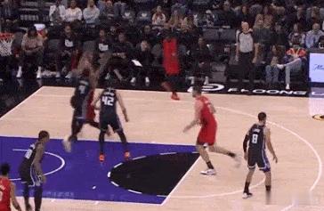 P7-9阿夫迪亚无球走位上前接球摆脱威少后顺势启动突破,小杨为了不干扰阿福攻框就地设置掩护卡住篮下护框的雷诺,阿福收球后横向上步随即一记“回头望月”反篮终结。