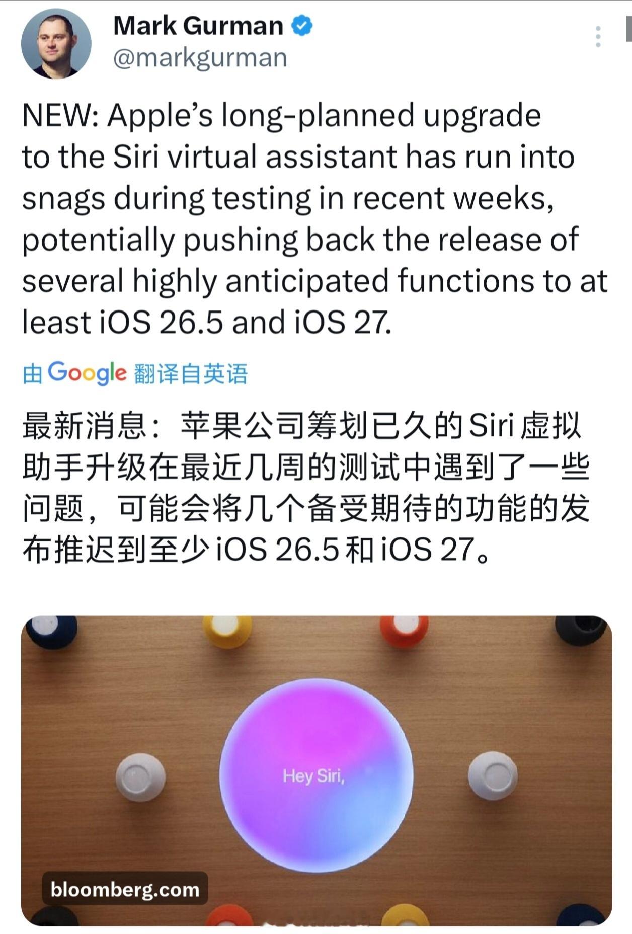 古尔曼爆料,苹果筹划已久的 Siri 升级在最近几周的测试中遇到了一些问题,可能会将几个备受期待的功能的发布推迟到至少 iOS 26.5 和 iOS 27。