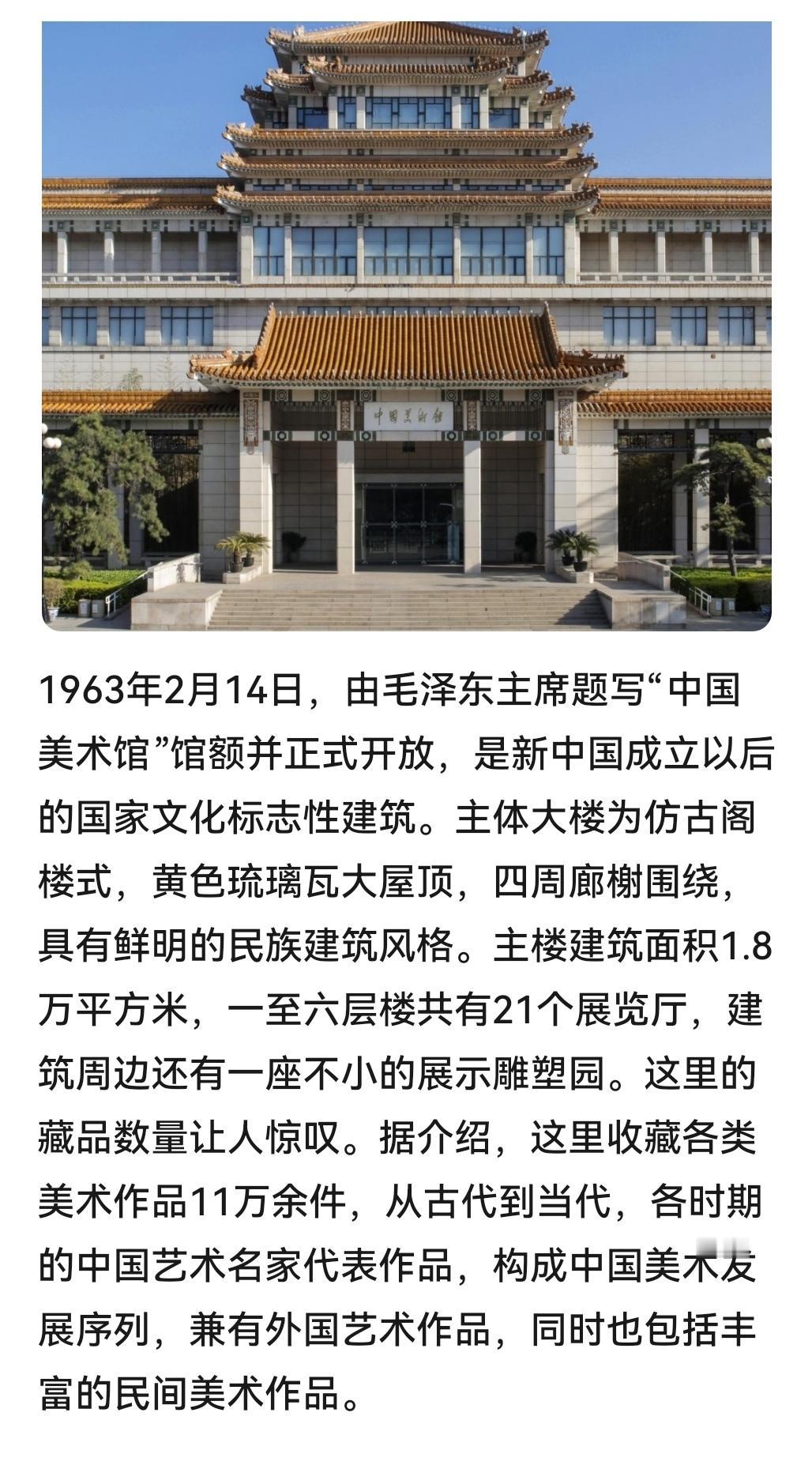 #建国丰功伟绩 历史上的今天:1963年2月14日,由毛泽东主席题写“中国美术馆”馆额并正式开放,是新中国成立以后的国家文化标志性建筑。主体大楼为仿古阁楼式,黄色琉璃瓦大屋顶,四周廊榭围绕,具有鲜明的民族建筑风格。主楼建筑面积1.8万平方米,一至六层楼共有21个展览厅,建筑周边还有一座不小的展示雕塑园。这里的藏品数量让人惊叹。据介绍,这里收藏各类美术作品11万余件,从古代到当代,各时期的中国艺术名家代表作品,构成中国美术发展序列,兼有外国艺术作品,同时也包括丰富的民间美术作品。