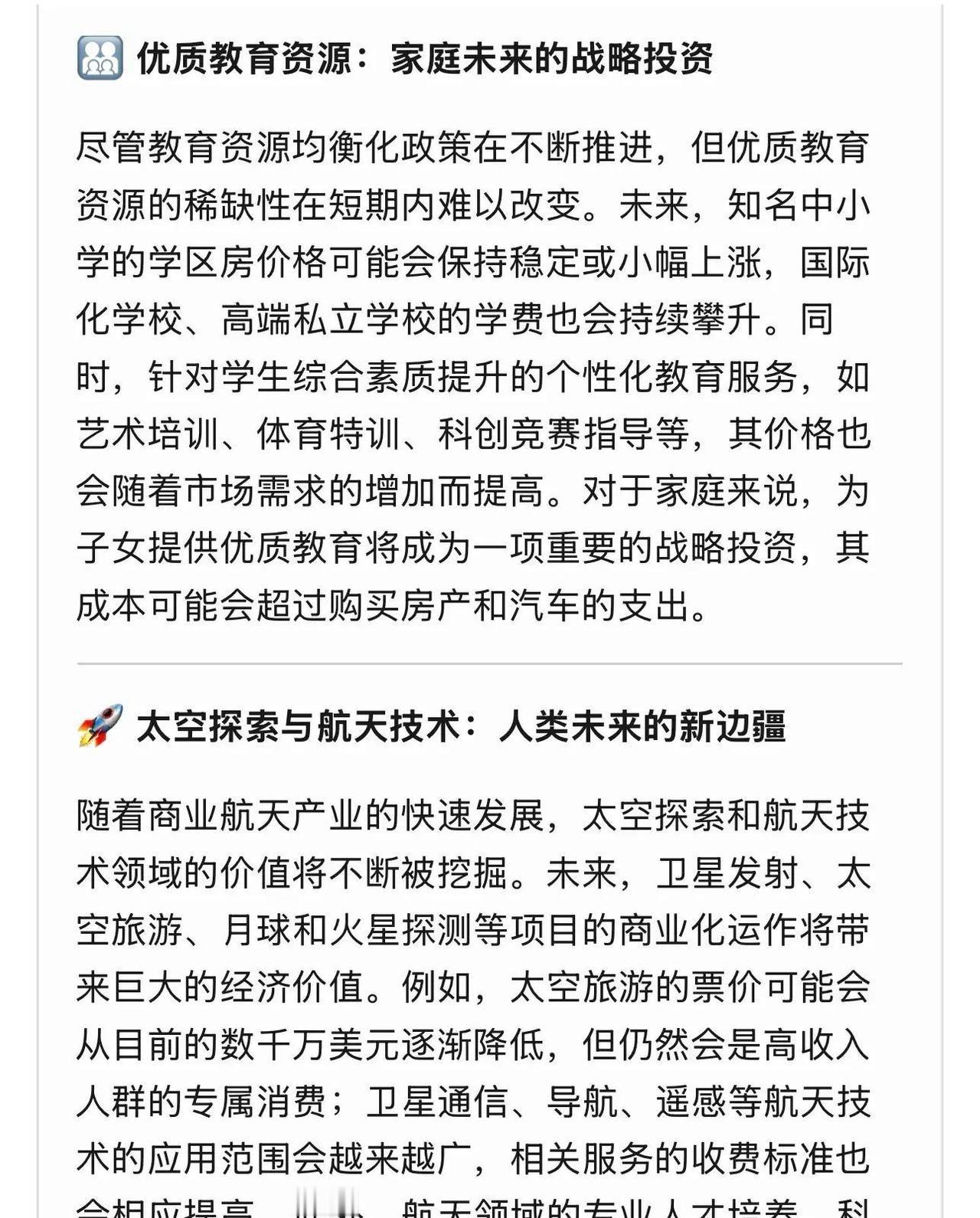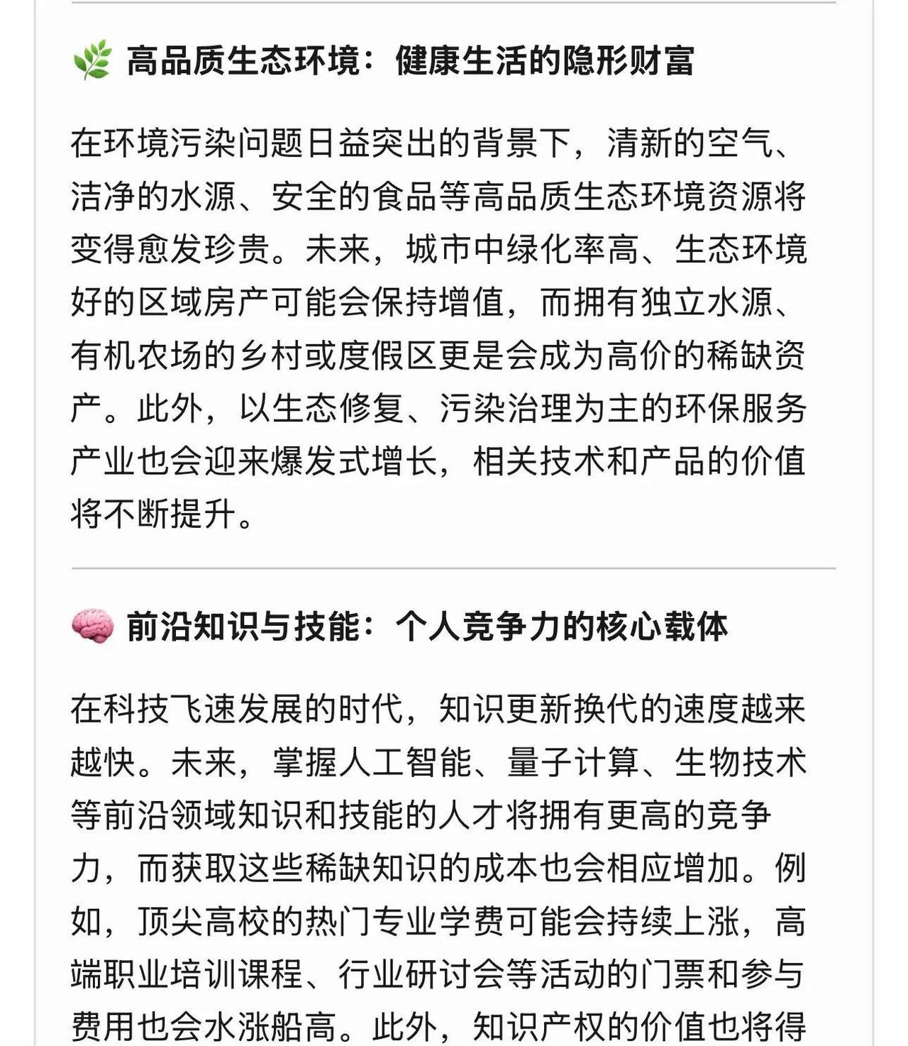 未来十年,房子车子可能不再是最大开销,真正让人掏空钱包的,是精准医疗、生态环境、前沿技能这些东西。 2026年看清了,健康寿命成了硬通货。很多人花大价钱做基因检测、抗衰老疗程,就是怕生病拖垮一生。精准医疗越来越贵,因为它直接针对个人基因定制方案,早筛早治能省下后期巨额医药费,可普通人想用上顶尖技术,动辄几万起步。 生态环境也开始值钱。干净空气、水源、绿色空间越来越少,城市里想住空气好的地方,房价之外还得加环境溢价。未来买房不光看地段,更看能不能呼吸到新鲜空气,这块成本只会涨。 前沿技能门槛拉高了。AI、生物科技、航天领域变化太快,学不会新东西就容易被淘汰。持续付费学习高端课程、掌握稀缺能力,比买车贵多了,因为它决定你能不能跟上时代不掉队。 优质教育资源同样稀缺。顶尖学校、个性化教学越来越贵,家长砸钱也要让孩子抢占先机,不然下一代竞争力直接下滑。 航天技术、文化IP、智能服务这些也在加速升值。太空旅游、独家故事IP、定制化智能助理,普通人想沾边,价格只会水涨船高。 未来十年拼的不是传统资产堆多少,而是健康、能力、认知这些核心竞争力。早点把钱投向让自己更强、更健康的方向,才是普通人翻身的最大机会。谁先布局,谁先吃到红利。不争,是一种什么境界? 孩子跟你顶嘴你是怎么处理的 人所有痛苦和烦恼的根源是什么?