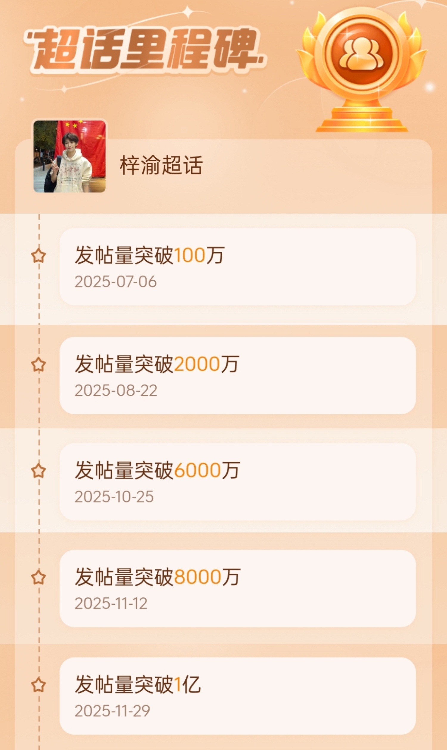 7月6日发帖量破100万!8月22日破2000万!10月25日发帖量破6000万!11月29日破亿!梓渝发帖量破2亿梓渝情人节写真