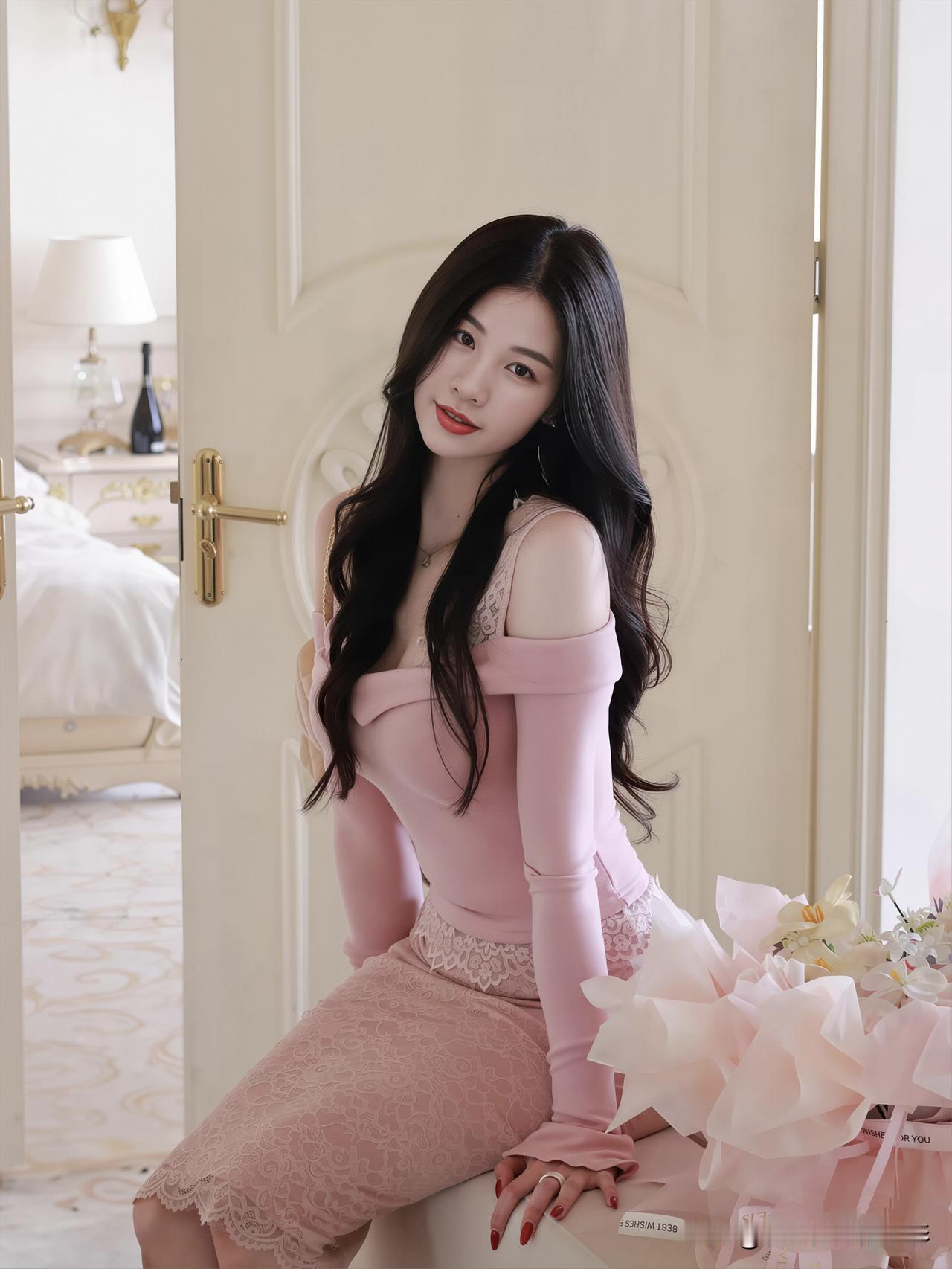 今日份温柔是粉色给的~蕾丝露肩上衣+包臀裙,优雅中透着小性感,再配上一束鲜花,氛围感直接拉满!新年新气象,愿我们都能活成自己喜欢的模样,温柔且坚定,独立又灿烂✨