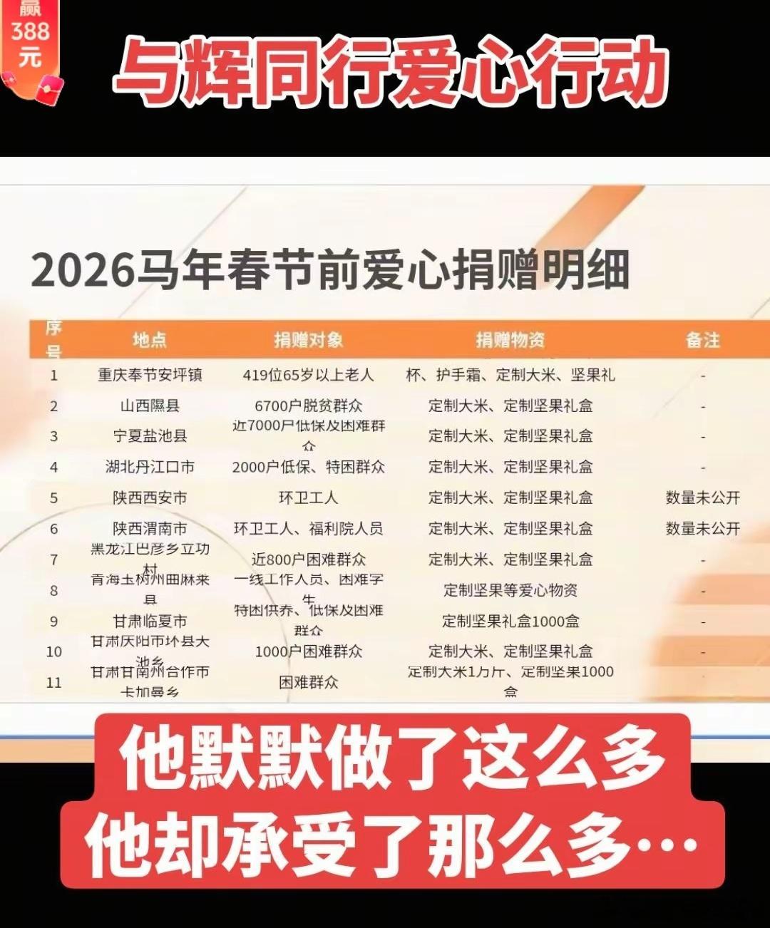 是金子在哪里都会发光一路看过来,看到其经历,也给每个人启示,思考,读书有用论,虽然不能让你立即暴富,但在关键时机会很好的抓住,书中自有黄金屋,没有随随便便的成功,就像与辉同行也经历了各种诋毁,但按自己的思路做好自己就好,与辉同行2月10日就放假了,老板的随意,让人看到企业文化,虽放假了但橱窗做起来无人售货,也卖的光光的,得民心者得天下董宇辉自己回老家还在拉磨,陕西新春团拜会,受到高度评价礼遇新年了又各处送年货温暖前面刚刚给李亚鹏的嫣然天使基金捐赠了很多,具体数字不得而知,但受到攻击后,李亚鹏受不了这样的做好事还被网暴,亲自出来辟谣,捐了比200万还要多很多,所以不能让做好人好事的人寒心,更不能让社会温度变冷,不要重演类似老人摔倒到底扶不扶的现象人红是非多,最近反诈老陈,有点恶心了,估计要被封了吧,去蹭流量,说卖的价格不同之类的,因时间,活动,平台等各种因素引发价格也是不同的,不能永远不同的。如果有证据那就直接交给帽子叔叔,而不是在网上碰瓷讹诈,去抓别人的小辫子,这就心思不正。就像上次说的,既然辞职了,就把老陈的IP账号还给前东家,不然做的事情就是容易造成早期粉丝误导,也给老东家抹黑,更失去公信力呢与辉同行 董宇辉