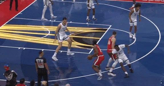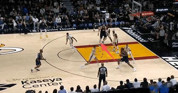 P3-5持球过半场的途中立即衔接和巴图姆在中线超高位置的“Drag Screen”配合成功点到鲍威尔错位,行进间变向走左路突破,在鲍威尔尝试下手切球的瞬间立即合球起步出手,成功制造犯规的同时还打进抛投。