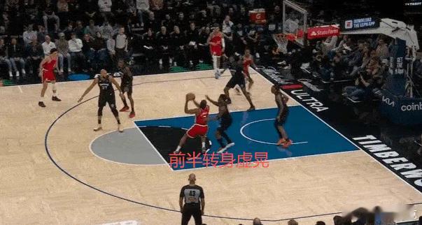 P6-7队友清空一侧,伦纳德面框转背身单打华子:背身大力炸球压至肘区附近后,使用晃肩+迅速向前的半转身+投篮虚晃,随后衔接上下步左手抛投终结。