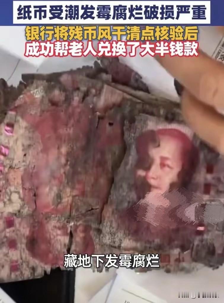 “就算是那些贪得无厌的巨贪,也不敢把钱埋得这么脏啊!” 大家见过藏私房钱的,见过藏床底下的,见过藏书里的,但把两万块钱直接藏进土里的,你见过没? 说出来你可能都不信,在河南信阳,真有人把辛苦攒的养老钱,全埋地底下了! 前两天,河南信阳的一家人抱着个塑料袋,火急火燎冲进银行。 工作人员打开一看,好家伙!一股子霉味儿直冲天灵盖,你要不说袋子里装的是钱,根本就认不出来。 据说这是家里老人干的好事,将近两万块的现金,觉得存银行不放心,还是老思想,得藏在自己看得见的地方才踏实。 藏哪儿呢?老人在地里挖了个坑,把钱埋进去,还做了个记号。寻思着这多安全,老鼠找不到,小偷更想不到。 结果等过段时间挖出来一看,老人差点没背过气去。 由于前段时间下雨,埋钱的地方受潮严重,这些钱早就发霉腐烂,粘成一团,稍微一碰就掉渣。 子女们又气又心疼,赶紧带着这堆“烂纸”到银行求助。 银行的员工也是够意思,忍着那股味儿,先一张张把残币风干,再小心翼翼地剥离、拼接,最后趴在柜台上,一张一张地核对防伪标识。 折腾了大半天,总算帮老人挽回了大部分损失。 其实可以理解,老辈人毕竟穷怕了,这是常年累月留下的习惯,总觉得钱换成数字不踏实。 别说老人了!现在年轻人没钱他也不踏实。 不过老人的这种“理财方式”,我倒是不太推荐了。风险太大。稍微不至于,就相当于给土地施肥了。 不过,银行这波操作,确实值得点个赞,有耐心也有人情味。 你家里老人怎样存钱呢?夹在书里?还是……