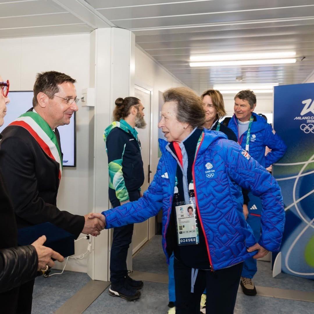 【补图】2026年2月10日,在丈夫蒂莫西劳伦斯爵士的陪同下,安妮长公主在意大利科尔蒂纳丹佩佐的科尔蒂纳冰壶奥运馆举行的冰壶双人混合铜牌赛之英国🇬🇧🆚意大利🇮🇹期间与科尔蒂纳丹佩佐市长Gianluca Lorenzi握手交谈🤝🏻🥌