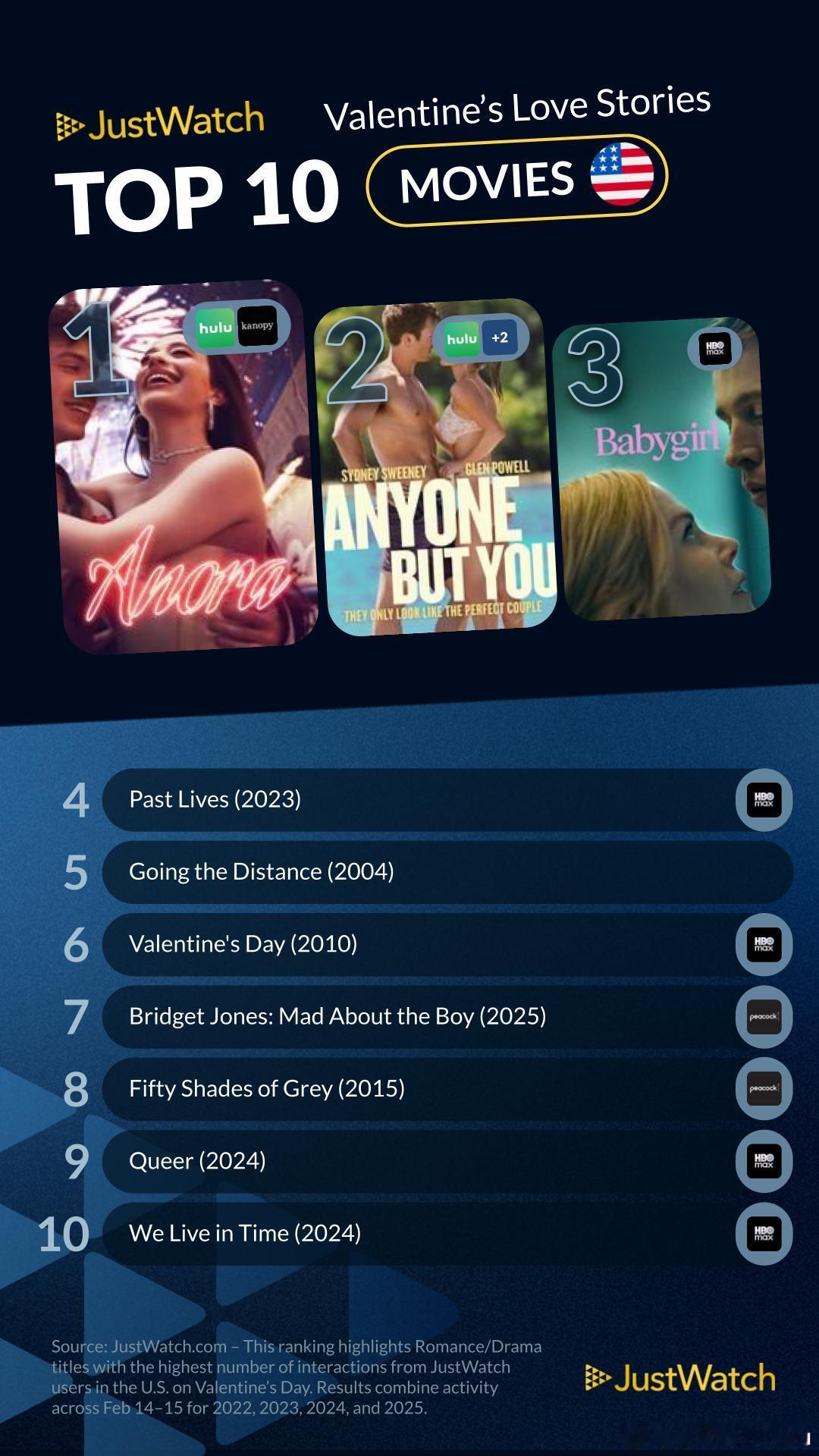 美国网站JustWatch统计过去四年在情人节重看次数最多的电影: