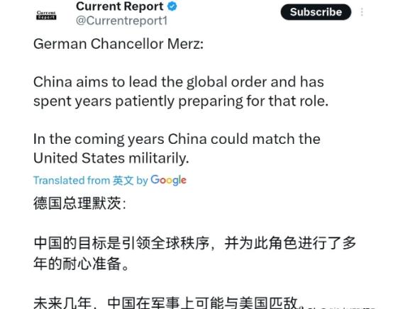 赶在访华之前,德国总理默茨表示,中国的目标是领导全球秩序,并为这一角色耐心准备了