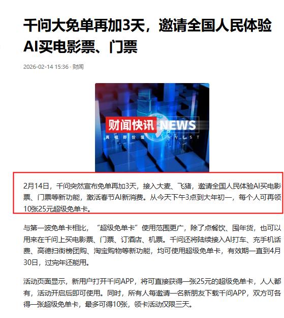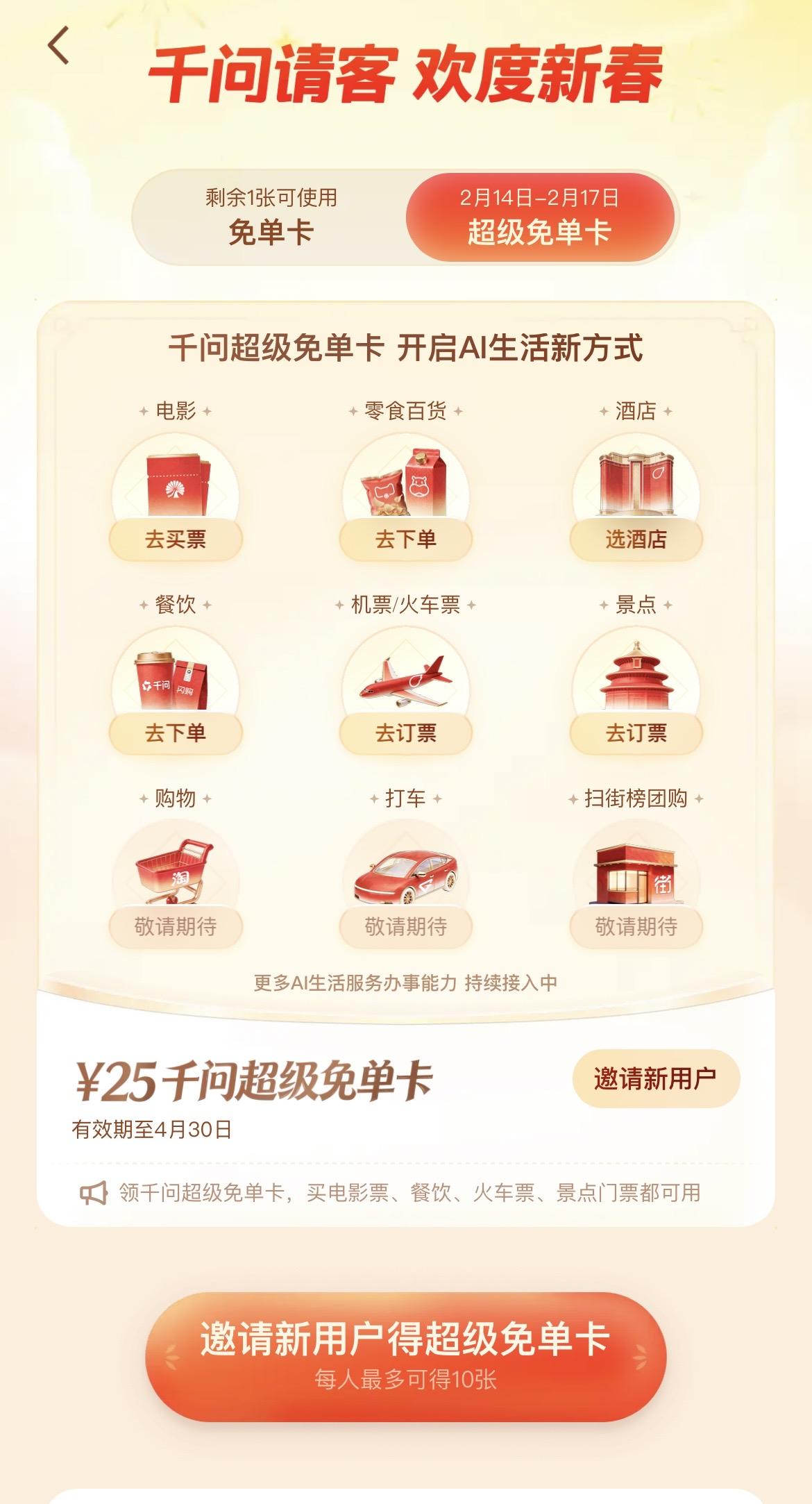 今年的春节,千问真是惊喜不断,免单再增加3天 前几天,千问官宣发起春节攻势,请全国人民喝奶茶,给每人最高21张免单卡,直接就点燃了消费。 那几天,朋友之间讨论,出现次数最多的词语就是“千问”,领免单卡成了大家的“头等大事”。 让人万万没想到的是,前一波热潮还没完全过去,千问新一轮攻势又来了,再免单三天,推出超级免单卡。 说实话,我是真没想到,千问这手笔真是爱了。 仔细看了下,这一次的超级免单卡延续了上一波大方的特点。 而且超级免单卡可以使用的范围变得更广了,可以AI订餐、买零食、订酒店、订电影票等等都能使用。 听说未来千问还可能可以上淘宝、打车、充话费等等。 一句话,生活中的吃喝玩乐,但凡要用到钱的,感觉千问超级免单卡都能使用。主打的就是一个你消费我请客! 而且大家也不用担心没时间用,因为这次超级免单卡有效期到4月30日,也就是还有两个多月的时间让你去用,安心抢就对了。