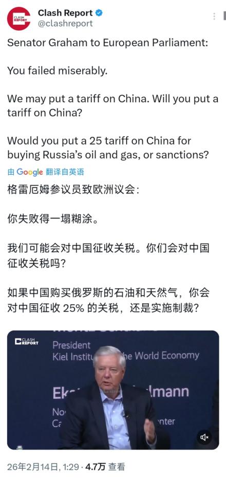 美国共和党籍参议员格雷厄姆北京时间2月14日在慕安会上喊话欧洲议会:“你们失败得一塌糊涂。我们可能会对中国征收关税。你们会对中国征收关税吗?如果中国购买俄罗斯的石油和天然气,你们会对中国征收25%的关税,还是实施制裁?” 他说这些话的时候,摆着一副高高在上的样子,好像美国说了算,欧洲必须跟着美国的指挥棒走,完全没考虑欧洲的实际情况。可明眼人都能看出来,他就是在慕安会上刷存在感,说的全是不负责任的大话,根本经不起推敲。 格雷厄姆这个人,他本身就是个爱鼓吹冲突、爱说硬话的参议员。根据公开消息,过去二十多年里,美国发起的几乎所有重大军事干预行动,他都表示支持,比如入侵伊拉克、阿富汗,还有北约主导的利比亚行动。 而且他背后还有美国国防企业的支持,自2019年以来,他从波音公司拿了超过5.5万美元的捐赠,还收到了洛克希德·马丁等其他国防承包商的捐款,这些企业都希望美国搞对抗、增加军费,格雷厄姆这么狂,说白了就是为了讨好这些企业,捞政治资本和经济好处。 再说说他叫嚣的“对华加征关税”,更是吹牛不打草稿。他说得好像特朗普政府真敢这么干一样,可实际上,特朗普政府之前就对中国加征过关税,最后吃亏的还是美国自己。 2018年,特朗普政府挑起对华贸易战,对大量中国输美商品加征关税,结果导致美国农产品出口受阻,很多美国农民损失惨重,政府还得花钱补贴农民;美国国内的物价也跟着上涨,老百姓买东西更贵了,生活成本大大增加。 现在美国国内经济本来就不好,复苏乏力,物价居高不下,老百姓意见很大。要是特朗普政府真的听从格雷厄姆的话,再次对中国加征关税,甚至对购买俄罗斯油气的中国加征25%关税,只会让美国的经济雪上加霜。 而且中国也不会坐以待毙,之前美国加征关税的时候,中国就采取了同等力度的反制措施,要是美国再敢挑衅,中国必然会继续维护自己的合法权益,到时候美国的损失只会更大,特朗普不可能不清楚这一点,根本不会真的冒这个险。 还有他逼着欧洲跟着对华加关税、实施制裁,更是痴心妄想。今年的慕安会,欧洲本身就有很多自己的焦虑,他们觉得现在的美国已经不是以前那个可靠的伙伴了,美国的疏离和善变,让欧洲很没有安全感。 而且欧洲和中国有很多贸易往来,中国是欧洲重要的贸易伙伴,欧洲很多企业都靠和中国做生意赚钱,要是对中国加征关税、实施制裁,欧洲自己的经济也会受到严重影响。 早在2025年4月,中国和欧盟就明确表示,要一起维护多边贸易体系,反对美国的单边主义和保护主义关税政策。 当时欧盟官员就说过,美国的关税政策严重影响了国际贸易,欧盟愿意和中国加强合作,而不是跟着美国搞对抗。所以不管格雷厄姆怎么逼,欧洲都不会因为他的一句话,就不顾自己的经济利益,盲目跟着美国对抗中国。 其实格雷厄姆之前就说过类似的狂言,他还曾起草过一份激进的制裁法案,规定对和俄罗斯进行能源贸易的国家加征500%的关税,其中就包括中国。 可这份法案在美国国内就遭到了反对,有美国参议员直接表示,这份法案要是通过,会给美国带来前所未有的经济灾难,最后这份法案也被参议院冻结了,根本没实施。这就说明,格雷厄姆说的话,大多都是不切实际的狂言,根本得不到支持。 格雷厄姆在慕安会上的这番表演,说白了就是一场政治作秀。现在美国大选临近,格雷厄姆是共和党人,一直和特朗普走得很近,他在慕安会上说这些硬话,一方面是为了帮特朗普造势,拉拢那些主张对华强硬的选民。 另一方面也是为了转移美国国内的矛盾,现在美国国内问题一大堆,他不想着解决自己国内的问题,反而跑到慕安会上骂欧洲、叫嚣对华强硬,就是想让老百姓忽略共和党在治理国家上的无能。 他的这些行径,不仅显得美国很没风度,还会破坏欧美之间的关系,毕竟上来就骂欧洲“失败得一塌糊涂”,换谁听了都不舒服。同时,这种公然叫嚣对华加征关税的行为,也会破坏中美关系,不利于全球贸易的稳定。 现在全球经济都在努力复苏,各国需要的是合作,而不是对抗,格雷厄姆这种挑事的行为,只会让全球经济面临更多不确定性,最后害人害己。 而且中方早就明确表态,反对美国这种单边主义、保护主义的行为,反对美国随意加征关税、实施制裁。中方曾说过,贸易战没有赢家,保护主义走不通,要是美国执意要挑起贸易摩擦,中国会坚决反击,直到维护好自己的合法权益。 格雷厄姆就是在慕安会上狂吠一通,纯属自我表演。他说的那些大话,根本没人信,也根本不可能实现。特朗普政府不会真的敢对华大规模加征关税,欧洲也不会跟着他干,他这么做,只是为了自己的政治利益,刷一刷存在感而已。
