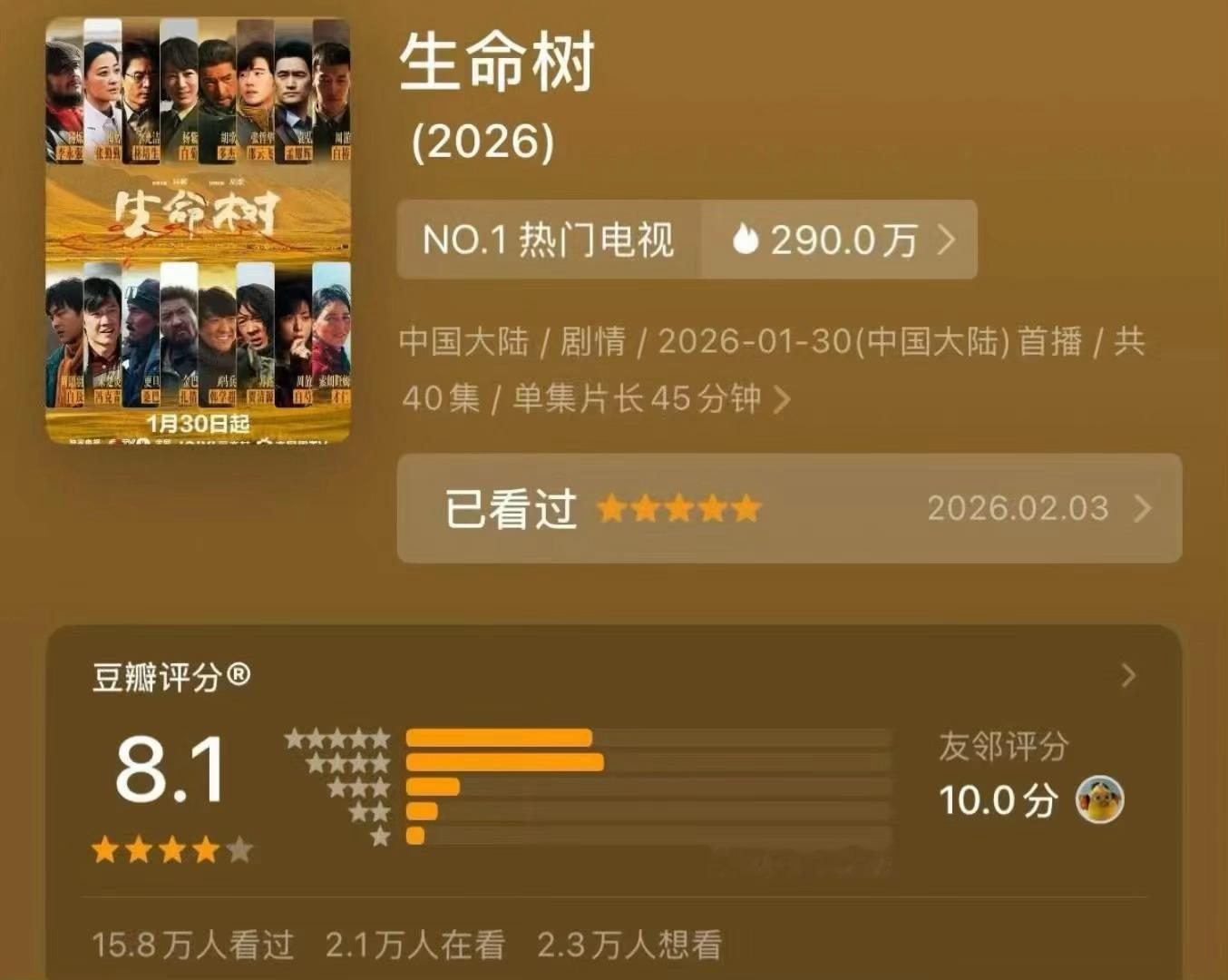 生命树豆瓣开分8.1杨紫 胡歌《生命树》开分8.1,是近期国产剧最高分了吧。觉得这个评分如何?看上去肯定是清了不少一星,之前那会10条里面都有6条一星的。