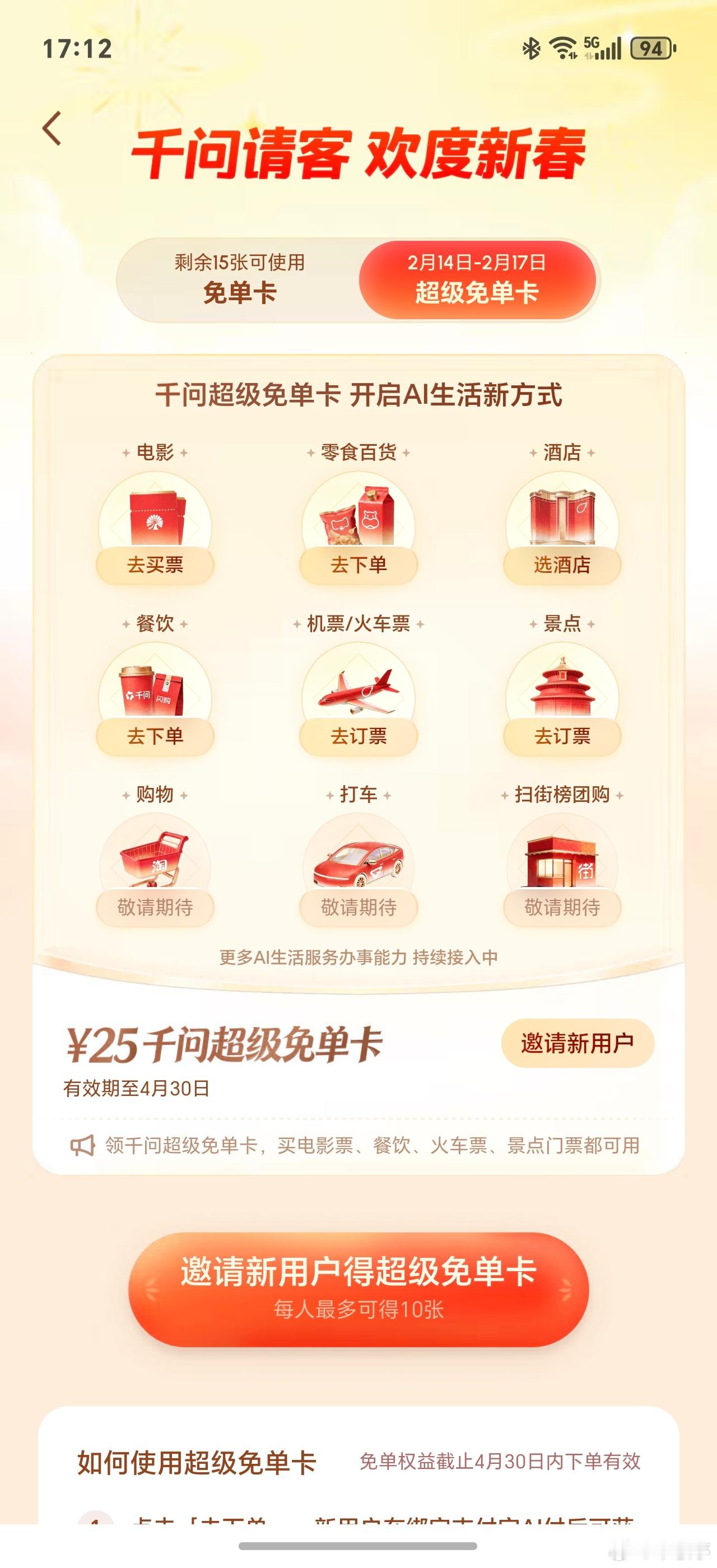 千问免单将可用于打车和充话费千问免单又加三天,而且支持的消费品类越来越多了,餐饮