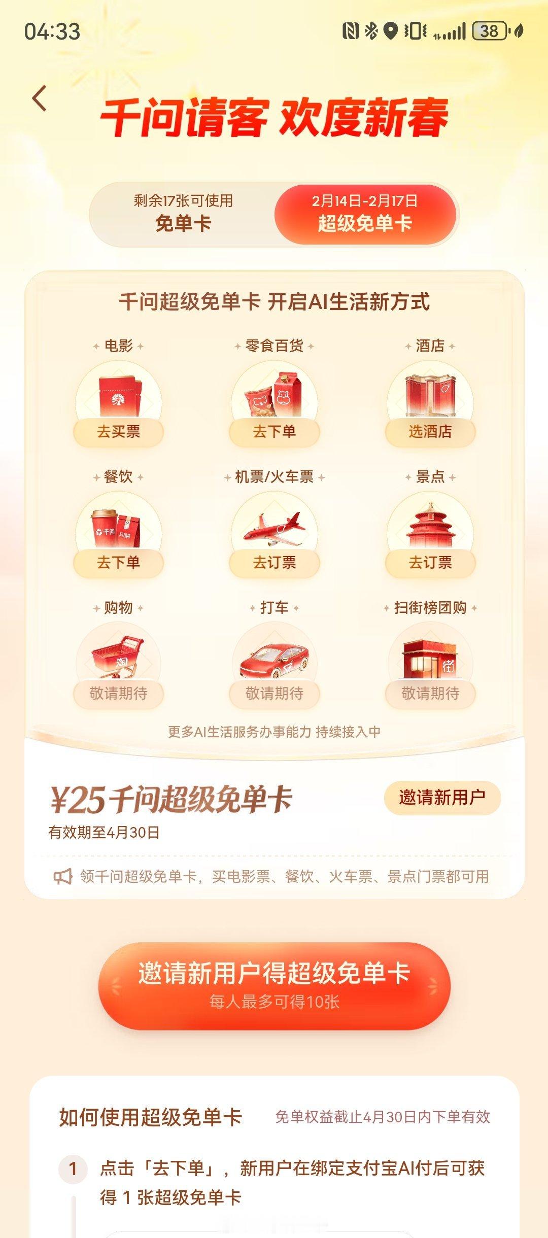 千问免单卡再加三天 前两天刚跟朋友说,千问第一波免单卡还没薅够,结果今天打开app发现又续上了。