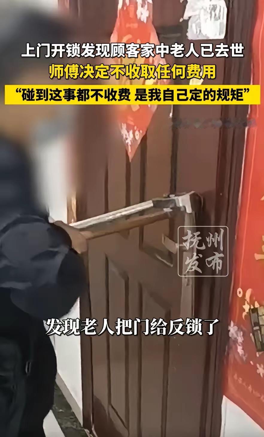 为湖南的这位开锁师傅点赞!这也是行业规则,一般遇到屋里有老人去世,通常不能收费,也是一种忌讳。但主人家通常也用其他方式表达感谢,比如给烟酒或者其他礼品。老人独自生活容易出现这种情况,无论子女还是保姆尽量还要一起生活照顾。随着孩子的减少,老人照顾问题是社会问题,要引发广泛重视。