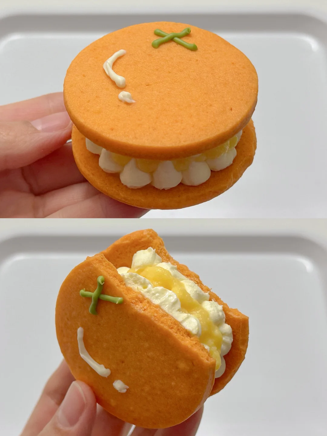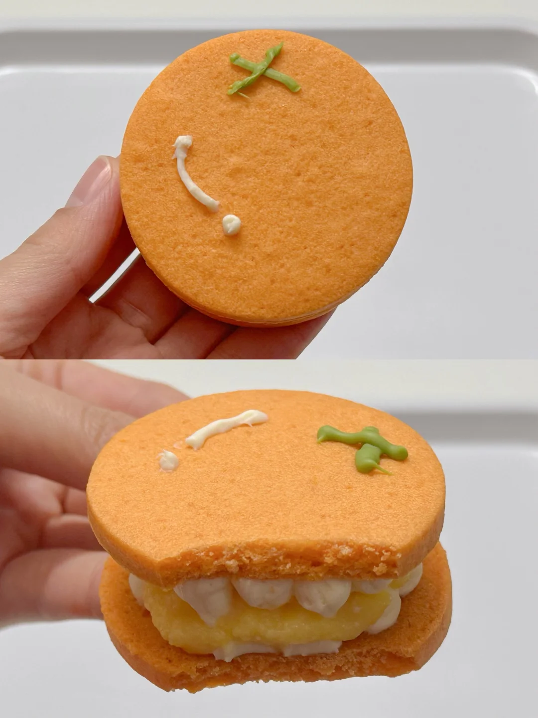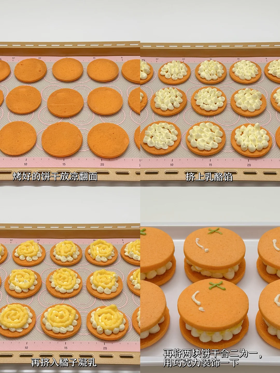 5️⃣烤好的饼干放凉后背面朝上,挤上乳酪馅,再挤入橘子凝乳,再将两块饼干合二为一,用巧克力装饰一下即可。