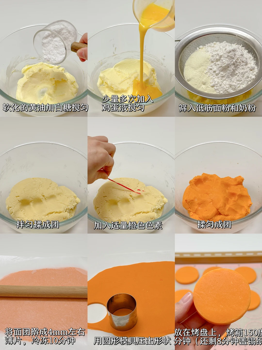 1️⃣软化的黄油加白糖搅匀,少量多次加入鸡蛋液搅匀,筛入低筋面粉和奶粉拌匀揉成团,加入适量橙色色素揉匀成团。
