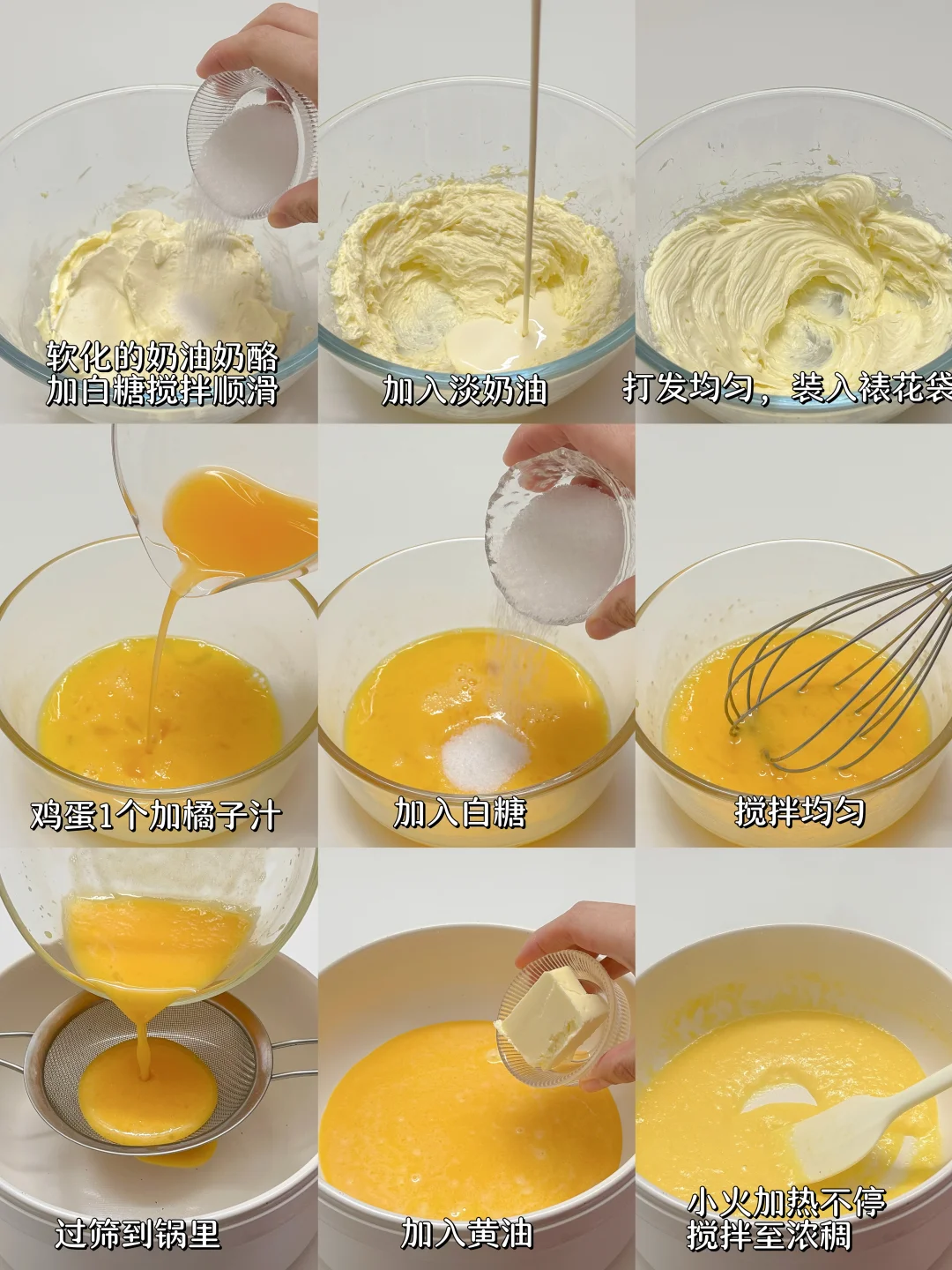 4️⃣鸡蛋1个➕橘子汁➕白糖搅拌均匀后过筛到锅里,加入黄油,开小火加热不停搅拌至浓稠即可。