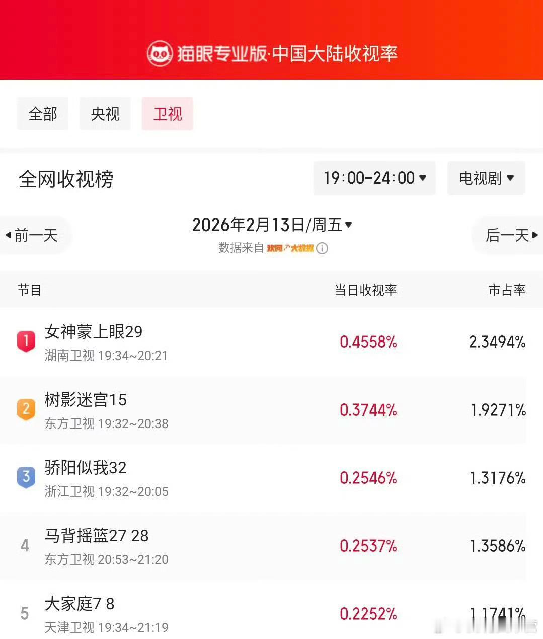 《女神蒙上眼》昨日单集卫视数据,全平台收视第一!