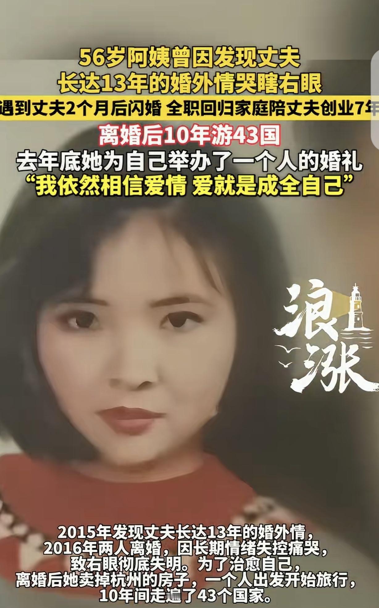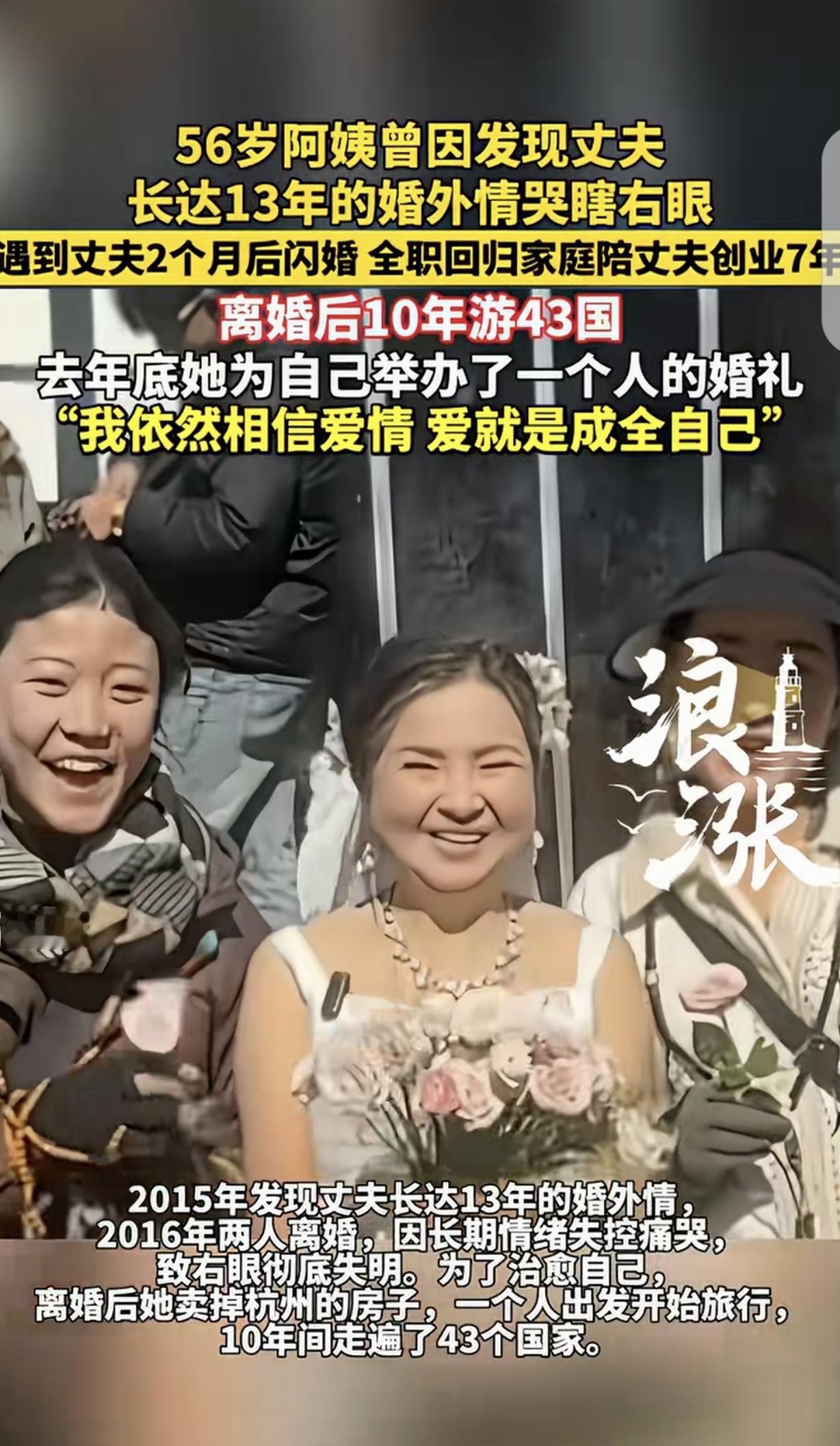 “这就是闪婚的代价!”浙江杭州,一56岁女子,年轻时认识丈夫2个月闪婚,陪丈夫创业7年后回归家庭,却发现丈夫13年婚外情,她哭瞎右眼,痛下决心离婚,然后卖掉房产,一个人10年走了43个国家,她为自己举办了一个人的婚礼。女子说了句话,一语点醒所有女人。 浙江杭州的南女士,年轻时从事护士工作,她是个勇敢又冲动的姑娘。 那时候,她遇到了后来的丈夫,仅仅相识2个月,就一头扎进了婚姻里,开启了闪婚生活。 婚后,南女士辞掉工作,陪着丈夫一起创业。那7年,她吃了多少苦,只有她自己知道。 白天,她跟着丈夫四处奔波拉业务,跑市场,和各种各样的人打交道,就为了能多签下一单生意。 晚上,她还要操持家务,照顾丈夫的饮食起居。虽然辛苦,但看着丈夫的事业一点点有了起色,她心里满是欣慰,觉得所有的付出都是值得的。 然而,命运却跟她开了个残酷的玩笑。2015年,回归家庭后的南女士,无意间发现了丈夫一个隐藏了13年的秘密,他竟然有了婚外情。 这个消息如同一声炸雷,瞬间将她的世界炸得粉碎。她不敢相信,那个曾经跟她山盟海誓,一起摸爬滚打的男人,竟然背叛了她这么多年。 南女士在痛苦中无法自拔,她整日以泪洗面,最终右眼哭瞎了。 那段时间,她身在深渊,她怨恨丈夫的背叛,也怨恨自己当初的冲动闪婚,更怨恨命运不公。 包受折磨一年,右眼彻底失明后,南女士彻底觉醒了,她选择离婚,离开了那个伤她最深的男人,选择做个坚强的女人。 南女士卖掉了杭州的房产,拿着这笔钱,踏上了独自旅行的征程。这一走,就是10年。 10年间,她去了43个国家,领略了不同的风土人情,见识了各种各样的生活方式。在旅途中,她结识了许多志同道合的朋友,也重新找回了对生活的热爱。 2025年,南女士来到了拉萨。在这片神圣的土地上,她为自己举办了一场一个人的婚礼。 她身着洁白的婚纱,脸上洋溢着幸福的笑容,仿佛在向全世界宣告:她已经从过去的伤痛中走了出来,迎来了全新的自己。 南女士说:“我依然相信爱情,爱其实就是成全自己。” 这句话,一语点醒无数女人。爱情或许会带来伤痛,但我们不能因此而放弃对生活的热爱。当我们勇敢地走出过去的阴影,去拥抱新的生活,就会发现,原来自己可以如此强大,如此美好。 南女士用自己的经历告诉我们,无论遭遇什么,都要学会爱自己,成全自己,这才是人生最重要的课题。 有人说,这说明男的有本事,不然你咋就一眼相中呢?只不过,不只能你一个人发现了男的优秀,结果出现了竞争者!至少男的还和你结了婚,你看看人家小三,没名没分也没像你这样寻死要活的!要想生活过得去,头上都得带点绿。 这种“男的有本事所以被爱,甚至出轨都情有可原”的说法,简直荒谬至极,是对婚姻忠诚和女性尊严的严重践踏。 婚姻是建立在相互尊重、信任和忠诚的基础之上的,这是婚姻的底线。 南女士当初闪婚,是基于对爱情的憧憬和对丈夫的信任,她全心全意地付出,陪丈夫创业,操持家务,这绝不是因为男方所谓的“有本事”就可以随意背叛的理由。 出轨是对婚姻最直接的伤害,是对伴侣感情的践踏,没有任何借口可以为其开脱。 第三者没名没分还介入他人婚姻,这绝不是值得宣扬和比较的事情,而是违背道德伦理的行为,绝不能被美化成“竞争者”。 “要想生活过得去,头上都得带点绿”这种说法更是无稽之谈,婚姻中的忠诚是必须坚守的,不能因为现实中存在一些不忠的现象,就认为这是正常的、可以接受的。 南女士在经历痛苦后勇敢离婚,独自旅行找回自我,这才是正确的选择。 我们应该尊重婚姻的忠诚,倡导积极健康的婚姻观,而不是为出轨行为找借口,去伤害那些在婚姻中受伤的人。 对此,你怎么看? 关注@运良说法